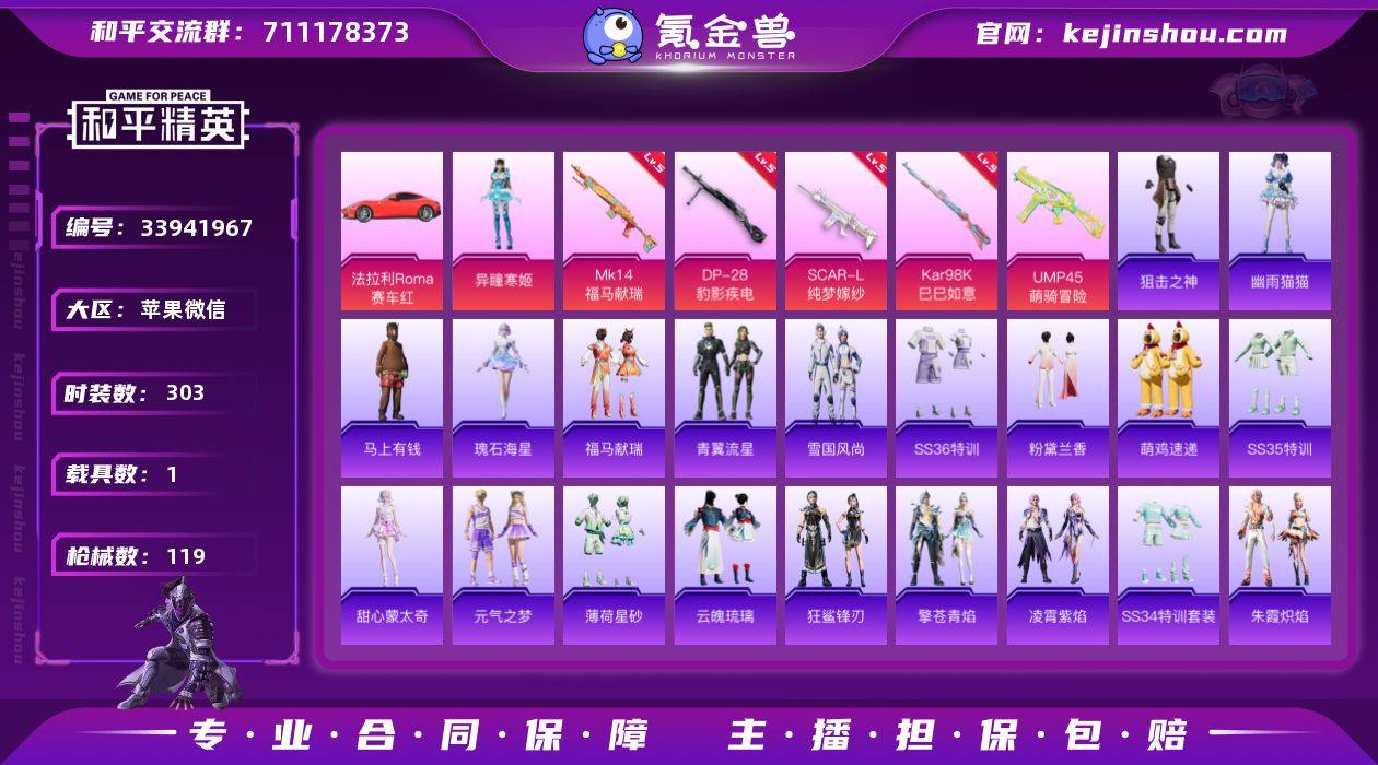 实名: 可修改 时装数: 303 载具数: 1 枪械数: 119 战备数: 1 热门装扮: 异瞳寒姬 载具: 法拉利Roma(赛车红) 稀有枪皮: SCAR-L纯梦嫁纱,Kar98K-巳巳如意,DP-28-豹影疾电,MK14-福马献瑞,UMP45-萌骑冒险