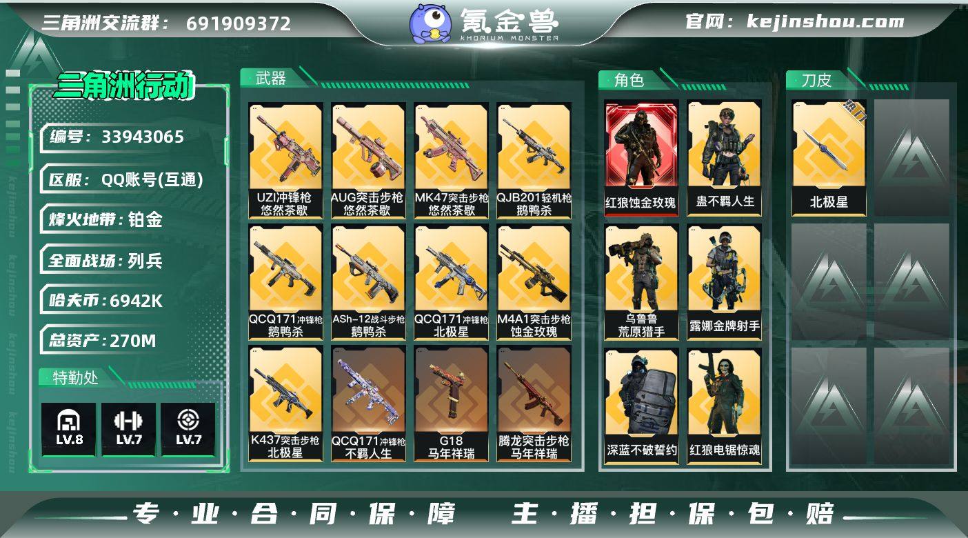 编号A01204 不可二次等级60 总资产270.9m 流动资233.3m 哈夫币6942k 1红皮 2刀皮 s8基础安全箱 仓库lv8 训练中心lv7 靶场lv7 蚀金玫瑰 近战武器-北极星 近战武器-处刑者