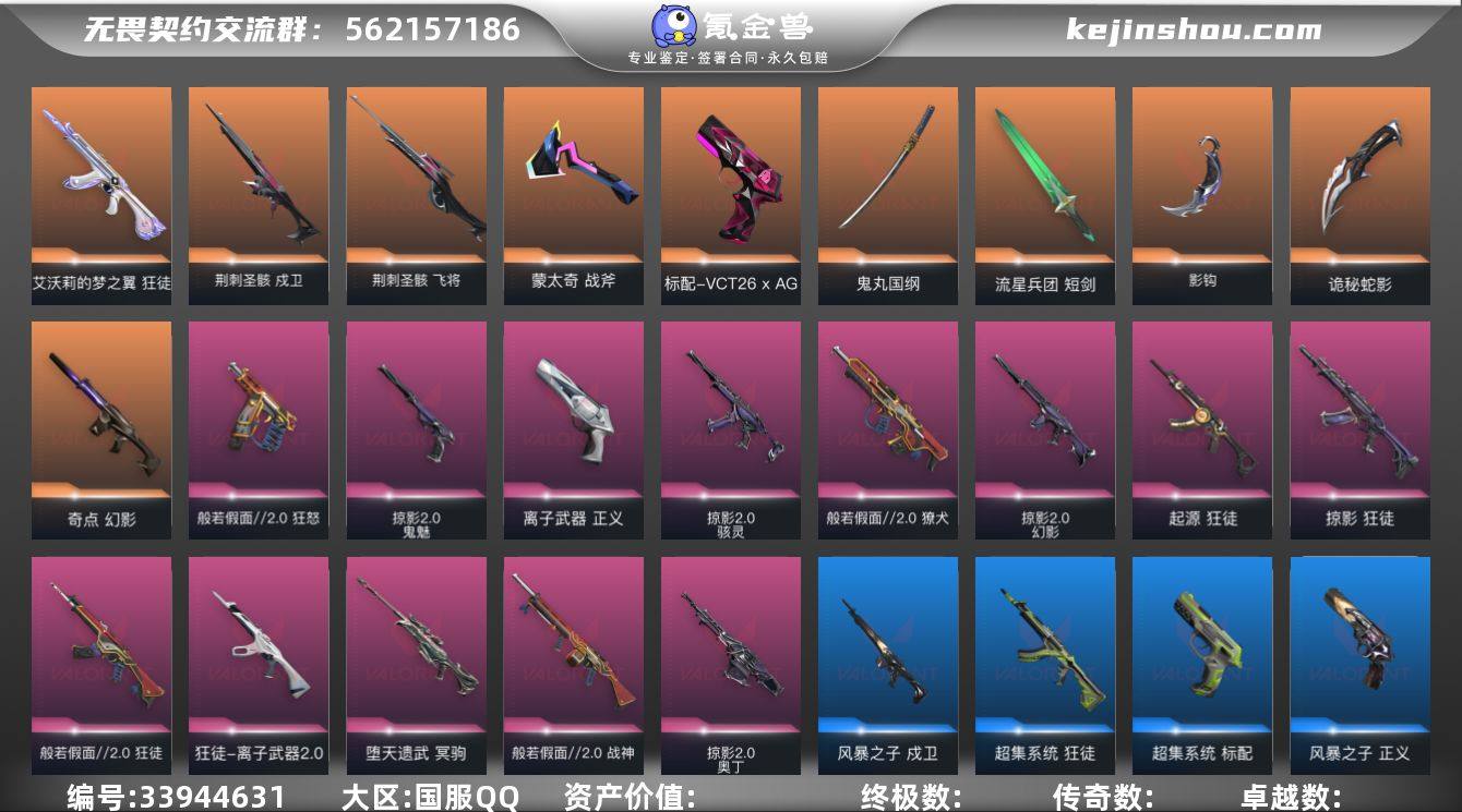 【 特价走量】精品手慢无系列!【可二次 可秒换绑】 【套装】:掠影//2.0套装,般若假面//2.0套装 【近战武器】:近战武器-蒙太奇 战斧,近战武器-影钩,近战武器-鬼丸国纲,近战武器-流星兵团 短剑,近战武器-诡秘蛇影 军刀 【狂徒】:狂徒-艾沃莉的梦之翼,狂徒-般若假面//2.0,狂徒-掠影,狂徒-起源,狂徒-离子武器//2.0,狂徒-流星兵团,狂徒-诡秘蛇影 【幻影】:幻影-奇点,幻影-掠影//2.0,幻影-蒙太奇,幻影-末日之翼 【戍卫】:戍卫-荆刺圣骸,戍卫-战术熊与伙伴们,戍卫-折光棱晶 【獠犬】:獠犬-般若假面//2.0 【冥驹】:冥驹-堕天遗武 【飞将】:飞将-荆刺圣骸,飞将-战术熊与伙伴们,飞将-末日之翼 【莽侠】:莽侠-诡秘蛇影,莽侠-纤云弄巧 【战神】:战神-般若假面//2.0,战神-蒙太奇 【奥丁】:奥丁-掠影//2.0,奥丁-流星兵团,奥丁-末日之翼 【判官】:判官-诡秘蛇影 【骇灵】:骇灵-掠影//2.0,骇灵-流星兵团,骇灵-蒙太奇 【蜂刺】:蜂刺-纤云弄巧,蜂刺-折光棱晶 【标配】:标配-超能偶像,标配-艺高胆大,标配-战术熊与伙伴们,标配-折光棱晶 【VCT手枪】:标配-VCT26 x AG 【正义】:正义-离子武器,正义-超限闪存,正义-纳米打击,正...