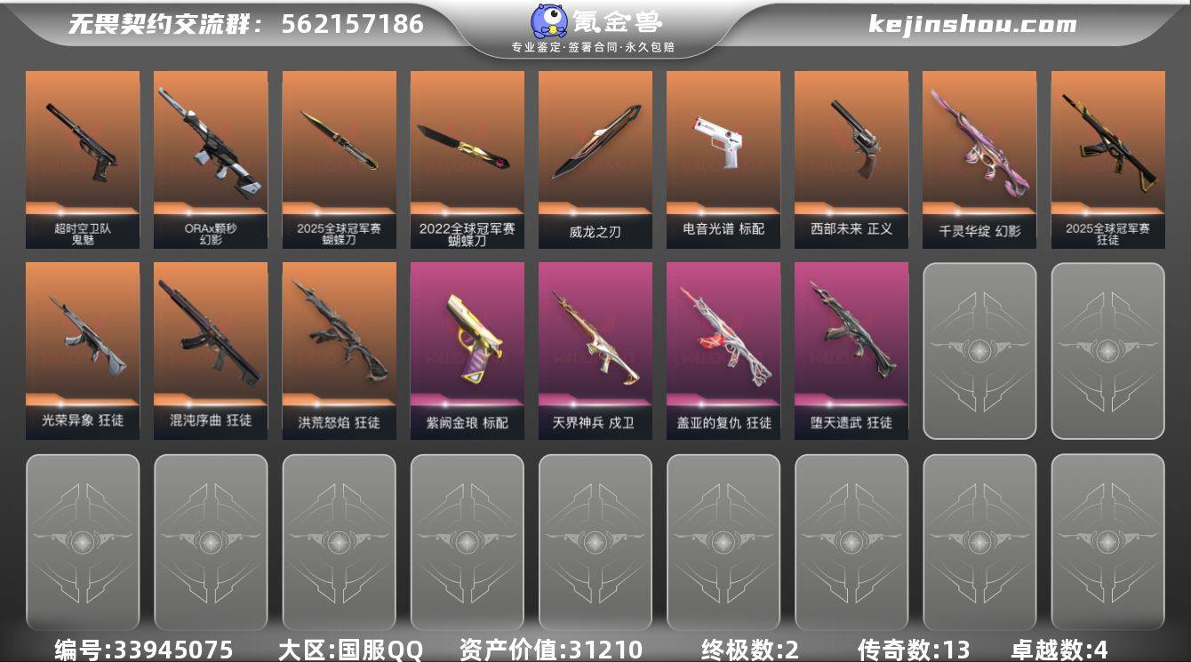 段位: 未定级 亮点皮肤: 蝴蝶刀-2022全球冠军赛 近战武器皮肤: 威龙之刃-耀鳞威龙,2025全球冠军赛 蝴蝶刀 步枪皮肤: 狂徒-盖亚的复仇,戍卫-天界神兵,狂徒-堕天遗武,狂徒-洪荒怒焰,幻影-千灵华绽,狂徒-混沌序曲,狂徒-光荣异象,2025全球冠军赛 狂徒,幻影-ORAx颗秒 佩枪皮肤: 标配-紫阙金琅,正义-西部未来,标配-电音光谱,鬼魅-超时空卫队 亮点: 【充值总皮肤】: 盖亚的复仇 狂徒, 电音光谱 标配, 混沌序曲 狂徒, ORA x 颗秒 幻影, 紫阙金琅 标配, 2025全球冠军赛 狂徒, 2025全球冠军赛 蝴蝶刀, 天界神兵 戍卫, 超时空卫队 鬼魅, 洪荒怒焰 狂徒, 威龙之刃, 堕天遗武 狂徒, 2022全球冠军赛 蝴蝶刀, 西部未来 正义, 千灵华绽 幻影, 光荣异象 狂徒
