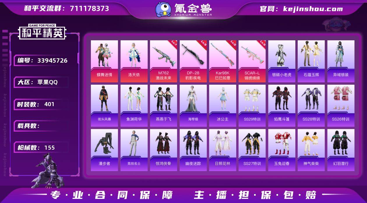 【特价出售】钱包不能注销苹果Q-2粉装4特效枪5热门105套装155枪皮 43907热力值 9印记 历史超级王牌4星 【2粉装】 蝶舞迷情 洛天依 【4特效枪】 SCAR-L-锦绣绵绵 (5级) Kar98K-巳巳如意 (5级) DP-28-豹影疾电 (5级) M762-激战未来 (7级) 【5热门】 Mark.06 龟仙人 银碳小老虎 豚鼠丹丹 漫步者 【1头盔】 百万伏特头盔