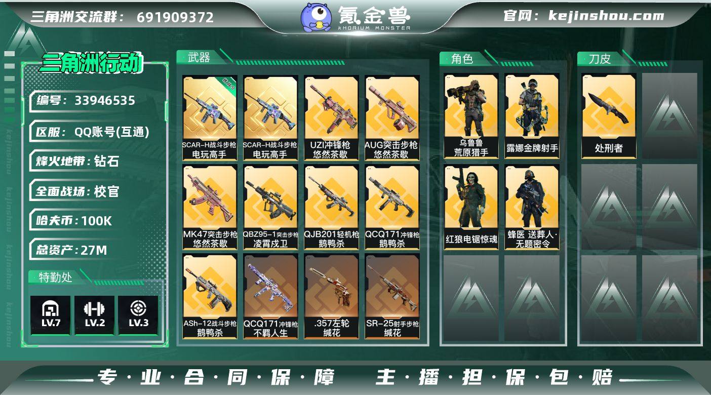 27m总资产-100k哈夫币-60烽火等级-钻石-50战场等级-校官 【干员外观】:蜂医-送葬人·无题密令,红狼-电锯惊魂,露娜-金牌射手,乌鲁鲁-荒原猎手 【近战皮肤】:近战-处刑者1级,近战-黑鹰 【典藏外观】:SCAR-H战斗步枪-电玩高手 【典藏外观成色】:SCAR-H战斗步枪-电玩高手(优品S) 【传说外观】:M4A1突击步枪-阿米娅,QBZ95-1突击步枪-凌霄戍卫,ASh-12战斗步枪-鹅鸭杀,K416突击步枪-行动记录,AUG突击步枪-悠然茶歇,SG552突击步枪-运动员,AK-12突击步枪-特斯拉线圈,SCAR-H战斗步枪-启航,G3战斗步枪-骑士,CAR-15突击步枪-阿米娅,KC17突击步枪-电锯惊魂,MK47突击步枪-悠然茶歇,Vector冲锋枪-能天使-午夜邮差,UZI冲锋枪-特斯拉线圈,UZI冲锋枪-悠然茶歇,SR-3M紧凑突击步枪-特斯拉线圈,勇士冲锋枪-能天使-午夜邮差,QCQ171冲锋枪-鹅鸭杀,QCQ171冲锋枪-不羁人生,725双管霰弹枪-送葬人-无题密令,QJB201轻机枪-鹅鸭杀,M14射手步枪-蛮荒,M14射手步枪-缄花,SR-25射手步枪-缄花,.357左轮-缄花 【史诗外观】:腾龙突击步枪-檀劫铳影,勇士冲锋枪-檀劫铳影,AKM突击步枪-林中猎手,QBZ95-1突击步枪-竞技风,K416突击步枪-冬日风情,K416突击步枪-腊梅,K416突击步枪...