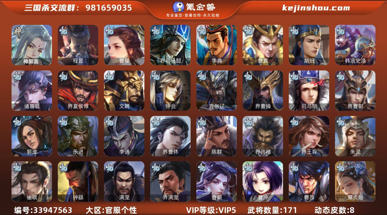 【JYSGS437】官阶:中军将军 VIP等级:VIP5级 史诗武将数:6 动态皮肤数:8 武将总数:171 史诗宝珠数:0 元宝数:2232 将魂数:3533 /神郭嘉/程昱/曹婴/谋马超/界黄忠/界左慈/卞夫人/蔡贞姬/崔琰/界曹操/界司马懿/界夏侯惇/界张辽/界许褚/钟会/曹冲/郭淮/满宠/曹真/韩浩史涣/陈群/曹叡/钟繇/界王异/界曹彰/界满宠/界曹休/诸葛诞/曹昂/SP关羽/SP姜维/文聘/乐进/司马朗/SP曹仁/李通/李典/朱灵/胡班/骥李典/华雄/袁术/势田丰/谋卢植/界华佗/界袁术/界庞德/公孙瓒/伏皇后/李儒/蔡夫人/公孙渊/界高顺/伏完/SP赵云/刘协/董承/樊稠/王濬/谋庞统/谋黄月英/糜夫人/界刘备/界关羽/界赵云/界马超/关兴张苞/廖化/关平/简雍/刘封/吴懿/周仓/张松/刘谌/夏侯氏/界关兴张苞/界马岱/马良/夏侯霸/SP徐庶/邓芝/诸葛果/霍峻/糜芳傅士仁/谋周瑜/谋韩当/蒋钦/界甘宁/界黄盖/界周瑜/界大乔/界陆逊/界小乔/程普/韩当/潘璋马忠/虞翻/孙鲁班/朱桓/顾雍/孙休/朱治/界韩当/界朱治/孙鲁育/张布/孙茹/凌操/神诸葛亮-孟章诛邪(动态)/神郭嘉-虎年清明(动态)/曹植-龙年中秋(动态)/诸葛亮-龙年限定(动态)/庞德公-超脱于世(动态)/李儒-业火毒计(动态)