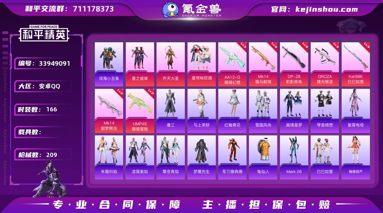【kyhp1630】安卓 手Q-3粉装-7特效枪-0载具-1粉色飞行器-56916热力值-15王牌印记-166套装-209枪皮 【热门品类】:套装-深海小丑鱼,角色-军刀雅典娜,套装-龟仙人,角色-Mark.06 【粉色套装】:粉装-星之彼岸,粉装-齐天大圣,粉装-星穹咏叹调 【粉色枪皮等级】:GROZA-镜光银凌(五级),UMP45-萌骑冒险(二级),Kar98K-巳巳如意(五级),Mk14-甜梦熊击(五级),Mk14-福马献瑞(五级),AA12-G-萌骑幻想(五级),DP-28-豹影疾电(五级) 【粉色枪皮】:GROZA-镜光银凌,UMP45-萌骑冒险,Kar98K-巳巳如意,Mk14-甜梦熊击,Mk14-福马献瑞,AA12-G-萌骑幻想,DP-28-豹影疾电 【粉色飞行器】:炫彩糖果飞行器 【粉色降落伞】:冠军兔兔降落伞,未来领航者降落伞,幻影飞狐降落伞,星穹咏叹调降落伞,幻彩电音降落伞,异瞳寒姬降落伞,天象三御降落伞,炫彩糖果降落伞 【稀有套装】:套装-龟仙人,套装-巳巳如意,套装-雪国风尚,套装-炫彩糖果,套装-马上来财,套装-糖糖葫芦,套装-青团波波,角色-临安公主,角色-怀庆长公主,套装-燕燕于飞,套装-鱼渊荷华,角色-风玲,套装-紫幽梦,套装-蓝冰羽,套装-星影赞美诗,套装-极速光影,套装-云朵鹅,套装-雪绒豹,套装-朱霞炽焰,套装-凌霄紫...