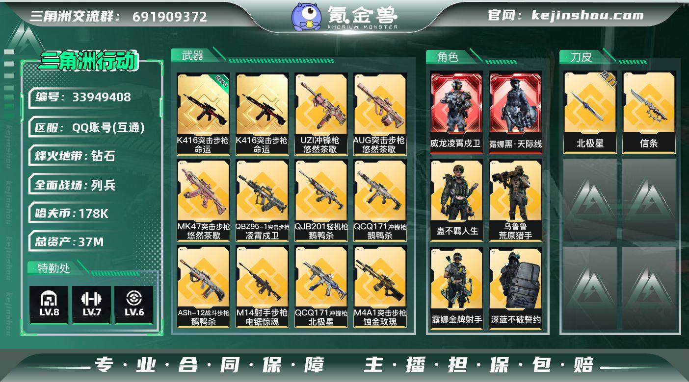 37m总资产-178k哈夫币-60烽火等级-钻石-38战场等级-列兵【干员外观】:露娜-黑·天际线,威龙-凌霄戍卫,威龙-飞虎,蜂医-送葬人·无题密令,无名-夜鹰,深蓝-不破誓约,红狼-电锯惊魂,露娜-金牌射手,乌鲁鲁-荒原猎手,蛊-不羁人生【近战皮肤】:近战-北极星,近战-信条,近战-黑鹰【典藏外观】:K416突击步枪-命运【典藏外观成色】:K416突击步枪-命运(优品C)【传说外观】:M4A1突击步枪-蚀金玫瑰,M4A1突击步枪-阿米娅,AKM突击步枪-锦绣,QBZ95-1突击步枪-凌霄戍卫,ASh-12战斗步枪-鹅鸭杀,AUG突击步枪-悠然茶歇,SG552突击步枪-运动员,AK-12突击步枪-夜鹰,AK-12突击步枪-特斯拉线圈,SCAR-H战斗步枪-启航,G3战斗步枪-骑士,CAR-15突击步枪-黑鹰坠落,CAR-15突击步枪-阿米娅,腾龙突击步枪-捞点薯条,腾龙突击步枪-马年祥瑞,腾龙突击步枪-万金泪冠,K437突击步枪-北极星,K437突击步枪-锦绣,KC17突击步枪-电锯惊魂,MK47突击步枪-悠然茶歇,UZI冲锋枪-特斯拉线圈,UZI冲锋枪-悠然茶歇,SMG-45冲锋枪-骑士,SMG-45冲锋枪-锦绣,SR-3M紧凑突击步枪-特斯拉线圈,勇士冲锋枪-能天使-午夜邮差,勇士冲锋枪-万金泪冠,QCQ171冲锋枪-北极星,QCQ171冲锋枪-鹅鸭杀,QCQ171冲...