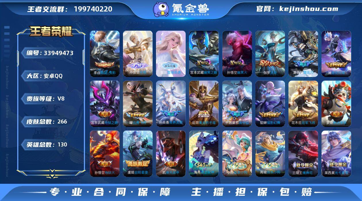 【WZAHC3146】贵族等级8/荣耀典藏数量1/传说皮肤数量14/史诗皮肤数量71/皮肤数量266/英雄数量130/段位至尊星耀/孙权全皮/空空儿全皮/武则天/鸣剑·曳影/无相/雪境奇遇-甄姬/幽冥之眼/幽冥火/夏侯惇霜北刀/澜逐花归海/画中仙/异界灵契/绛天战甲/启明星使/云鹰飞将/太华/猫影幻舞/冠军飞将/胖达荣荣/黄金射手座/地狱之眼/地狱火/狰(s8)/天穹之誓(s36)/阴阳师/凯尔特女王(s7)/皇家上将/百木心枪/优雅恋人/白昼王子/狮舞东方/高山流水/妖精王(s5)/炼金王(s6)/重明(s11)/幻夜卜梦/猎兽之王/云间偶戏/无心/朔风刀(s17)/游园惊梦/烛龙(s10)/穷奇(s12)/蓝屏警告/暗影游猎/魔术师/万华元夜(s22)/星际陆战队-达摩/沙漠行僧(s26)/海滩派对/醍醐杖(s20)/冰锋战神/演武夺筹(s23)/一生所爱/飞衡/傲雪梅枪/金庭之子(s27)/潮玩骑士王/至尊宝/御旌(s15)/圣弓游侠/云中旅人(s29)/神迹守卫-钟馗/驱傩正仪(s24)/朔望之晖/真爱魔法/单词大作战/黎明之约/繁星吟游/饕餮(s9)/原初探秘者(s21)/五谷丰年/火炮绅士/千军破阵(s25)/原初追遂者/朱雀志/混沌棋(s18)/顽趣-梦奇/大漠名商(s28)/疑决卦(s19)/李小龙/擒涛扼浪(s31)/御狮(s13)/御霄(s14)/胡桃异想国/纤云弄巧/御銮(s16)/西部大镖客-猪八戒/梁祝/天...