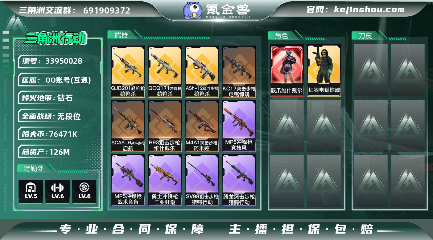 【AYS129】 【店主推荐捡漏号!可直接换绑】76471k哈伏币-115m流动资产-60烽火等级-钻石-1战场等级-无军衔 【干员外观】:骇爪-维什戴尔,红狼-电锯惊魂 【近战皮肤】:近战-黑鹰 【传说外观】:M4A1突击步枪-阿米娅,ASh-12战斗步枪-鹅鸭杀,SCAR-H战斗步枪-启航,KC17突击步枪-电锯惊魂,QCQ171冲锋枪-鹅鸭杀,QJB201轻机枪-鹅鸭杀,R93狙击步枪-维什戴尔 【史诗外观】:QBZ95-1突击步枪-曙光,腾龙突击步枪-猎鳄行动,MP5冲锋枪-战术竞备,MP5冲锋枪-竞技风,勇士冲锋枪-工业狂潮,SVD狙击步枪-阿萨拉工艺,SV-98狙击步枪-猎鳄行动 【稀有外观】:AKM突击步枪-肃杀,QBZ95-1突击步枪-公平竞技,M7战斗步枪-捣蛋鬼,SCAR-H战斗步枪-荣耀列队,腾龙突击步枪-冰天雪地,MP5冲锋枪-哈夫克卫队,P90冲锋枪-黄昏,P90冲锋枪-捣蛋鬼,UZI冲锋枪-亚特兰蒂斯,SMG-45-行动开启,勇士冲锋枪-冰天雪地,QJB201轻机枪-哈夫克卫队,Mini-14射手步枪-荣耀列队,G18-星链科技,G18-哈夫克航天 【普通外观】:M4A1突击步枪-粉色涂装,M4A1突击步枪-高雅黑,QBZ95-1突击步枪-三角洲力量,QBZ95-1突击步枪-海色,QBZ191突击步枪-三角洲力量,K416突击步枪-几何迷彩,M16A4突击步枪-高雅黑,M7...