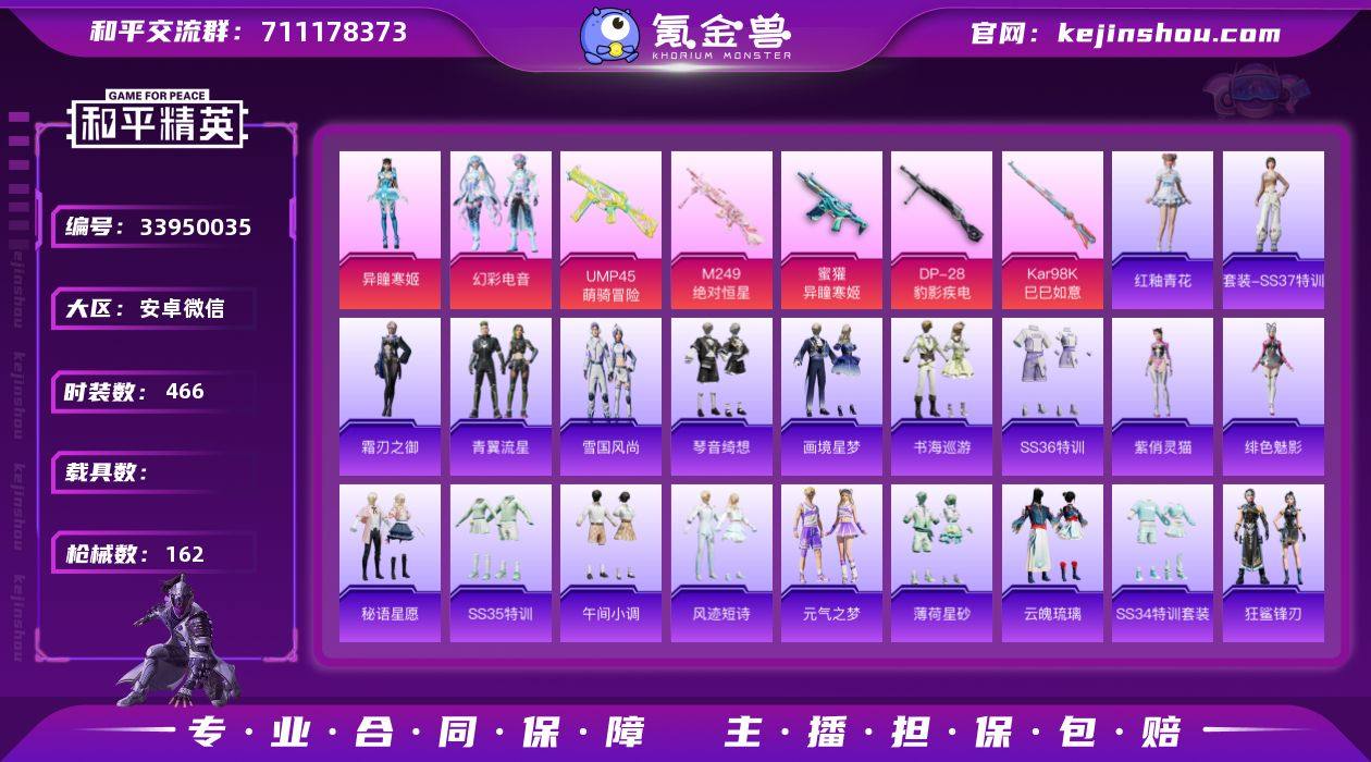 AL706755 【肝了多年心血号,寻有缘人接手】 热力值43049 枪皮数量162 粉装数2 套装数量115 时装数466 战备数115 【是本人】 【可排位】 【包人脸】 【是】 【支持】 【未绑定或可换绑】 【无换绑CD】 【是】 【否】 【启用】 【否】 【是】 【是】 【是否接受还价】 【子账号】 【同意将绑定的微信一并转移】 【我已知晓 并同意配合】 【商家商品编号】 其他武器皮肤147 头盔79 动作36 伙伴4 其他武器皮肤:蜜獾-天降萌叽,蜜獾-乌木金纹,蜜獾-启元战纹,蜜獾-风迹短诗,蜜獾-糖糖葫芦,ACE32-冰晶雪宝,ACE32-画境星梦,AKM-破晓战魂,AKM-霓彩脉冲,AKM-龙的传人,AKM-荧星灵猫,M762-登顶巅峰,M762-天降萌叽,M762-云朵鹅,M762-雏菊兔兔,AC-VAL-玩趣呆呆,AC-VAL-牡丹亭游园,AC-VAL-乌木金纹,GROZA-影袭,GROZA-福马献瑞,GROZA-紫矿核心,GROZA-荧海星豚,SCAR-L-炫彩节奏,SCAR-L-夜灯,SCAR-L-彩虹符号,SCAR-L-星途旅人,M16A4-幻世战舞者,M16A4-雨过天青,Famas-乌木金纹,Famas-霓彩脉冲,Mk47-风迹短诗,AUG-异域银装,AUG-绝对恒星,AUG-幻影战神,AUG-耀粉歌者,ARX-凌霄紫焰,QBZ-彩虹符号,M416-蓝色火焰,M416-红色方程式,G36C-星穹咏叹调,Kar98K-顶...