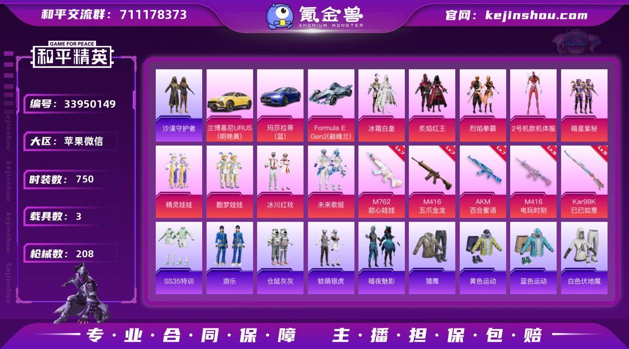 实名: 可修改 时装数: 750 载具数: 3 枪械数: 208 战备数: 3 热门装扮: 炙焰红王,冰霜白皇,烈焰拳霸,2号机款机体服,精灵娃娃,酣梦娃娃,暗星紫秘,冰川红玫,沙漠守护者,仓鼠灰灰,软萌银虎,未来歌姬,暗夜魅影 载具: 玛莎拉蒂Ghibli(蓝),兰博基尼URUS(明艳黄),Formula E Gen2(巅峰兰) 稀有枪皮: M416五爪金龙,M762甜心娃娃,M416电玩时刻,Kar98K-巳巳如意 亮点: 【优质装备】:2号机款机体服(红螳螂),沙漠守护者(黑丝),七级AKM-百合蜜语,七级M762-甜心娃娃,七级M416-五爪金龙