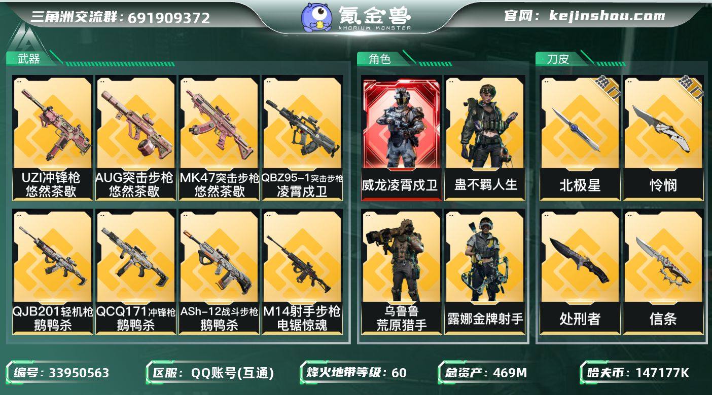 总资产469M/哈夫币14717万/传说近战数4/干员外观数6/传说枪皮数36/战场等级2/行动等级60/安全箱等时效性道具以游戏内数据为准,详情请看图/威龙-凌霄戍卫/深蓝-不破誓约(S6)/红狼-电锯惊魂/露娜-金牌射手(S7)/乌鲁鲁-荒原猎手/蛊-不羁人生/近战-北极星/近战-信条/近战-怜悯/近战-处刑者/近战-黑鹰/M4A1突击步枪-阿米娅/AKM突击步枪-锦绣/QBZ95-1突击步枪-凌霄戍卫/ASh-12战斗步枪-鹅鸭杀/K416突击步枪-行动记录/AUG突击步枪-悠然茶歇/SG552突击步枪-运动员/SCAR-H战斗步枪-启航/G3战斗步枪-骑士/CAR-15突击步枪-阿米娅/腾龙突击步枪-捞点薯条/腾龙突击步枪-马年祥瑞/腾龙突击步枪-万金泪冠/K437突击步枪-北极星/K437突击步枪-锦绣/KC17突击步枪-电锯惊魂/MK47突击步枪-悠然茶歇/UZI冲锋枪-悠然茶歇/SMG-45冲锋枪-锦绣/勇士冲锋枪-能天使-午夜邮差/勇士冲锋枪-万金泪冠/QCQ171冲锋枪-北极星/QCQ171冲锋枪-鹅鸭杀/QCQ171冲锋枪-不羁人生/M250通用机枪-骑士之心/QJB201轻机枪-鹅鸭杀/M14射手步枪-电锯惊魂/M14射手步枪-蛮荒/M14射手步枪-缄花/SKS射手步枪-骑士/SR-25射手步枪-缄花/AWM狙击步枪-捞点薯条/AWM狙击步枪-万金泪冠/.357左轮-缄花/G18-马年祥瑞/93R-捞点薯条/PTR-32突...