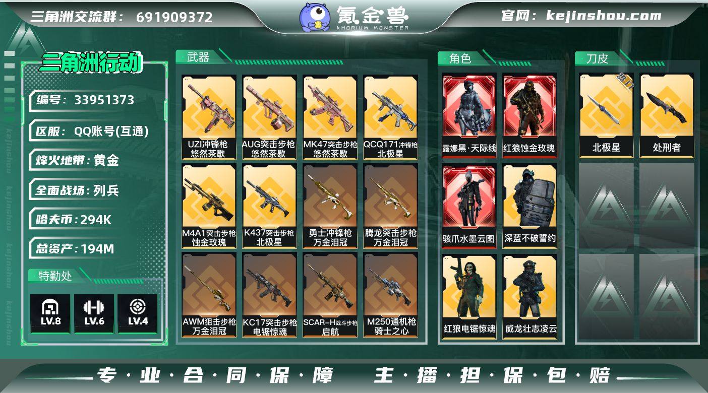 194m总资产-294k哈夫币-60烽火等级-黄金-18战场等级-列兵 【干员外观】:红狼-蚀金玫瑰,骇爪-水墨云图,露娜-黑·天际线,威龙-壮志凌云,蜂医-送葬人·无题密令,无名-夜鹰,深蓝-不破誓约,红狼-电锯惊魂 【近战皮肤】:近战-北极星,近战-处刑者1级,近战-黑鹰 【传说外观】:M4A1突击步枪-蚀金玫瑰,M4A1突击步枪-阿米娅,AUG突击步枪-悠然茶歇,AK-12突击步枪-夜鹰,AK-12突击步枪-特斯拉线圈,SCAR-H战斗步枪-铁艺苍穹,SCAR-H战斗步枪-水墨云图,SCAR-H战斗步枪-启航,CAR-15突击步枪-阿米娅,腾龙突击步枪-捞点薯条,腾龙突击步枪-万金泪冠,K437突击步枪-北极星,KC17突击步枪-电锯惊魂,MK47突击步枪-悠然茶歇,UZI冲锋枪-特斯拉线圈,UZI冲锋枪-悠然茶歇,SMG-45冲锋枪-骑士,SR-3M紧凑突击步枪-特斯拉线圈,勇士冲锋枪-能天使-午夜邮差,勇士冲锋枪-万金泪冠,QCQ171冲锋枪-北极星,725双管霰弹枪-送葬人-无题密令,M250通用机枪-骑士之心,AWM狙击步枪-捞点薯条,AWM狙击步枪-万金泪冠,93R-捞点薯条,复合弓-黑·天际线 【史诗外观】:M4A1突击步枪-特勤执行,AKM突击步枪-林中猎手,QBZ95-1突击步枪-曙光,QBZ95-1突击步枪-ACE,ASh-12战斗步枪-守夜人,ASh-12战...