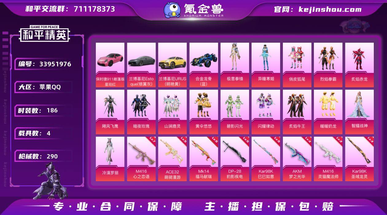 【LHPX2494】【特价出售/店主推荐】苹果 手Q-15粉装-9特效枪-4载具-10粉色飞行器-102350热力值-6王牌印记-186套装-290枪皮 【热门品类】:熔岩游骑兵连帽夹克 【粉色套装】:粉装-俏皮狐尾,粉装-烈焰拳霸,粉装-炙焰赤龙,粉装-飓风飞鹰,粉装-暗夜玫瑰,粉装-山涧鹿灵,粉装-黄伞悠悠,粉装-碧影闪光,粉装-闪耀律动,粉装-炙焰牛王,粉装-暖暖奶龙,角色-智耀战神,角色-冷漠罗丽,角色-异瞳寒姬,粉装-极意拳锋 【粉色枪皮等级】:AKM-梦之光华(三级),M416-心之恋语(七级),M416-灵猫魔法师(三级),ACE32-萌骑漫游(五级),Kar98K-巳巳如意(五级),Kar98K-圣域龙灵(三级),Mk14-福马献瑞(五级),DP-28-豹影疾电(五级),MG-36-虹云熊熊(一级) 【粉色载具】:兰博基尼Estoque(银翼灰),兰博基尼URUS(明艳黄),保时捷911 敞篷版(星珀红),合金龙骨(蓝) 【粉色枪皮】:AKM-梦之光华,M416-心之恋语,M416-灵猫魔法师,ACE32-萌骑漫游,Kar98K-巳巳如意,Kar98K-圣域龙灵,Mk14-福马献瑞,DP-28-豹影疾电,MG-36-虹云熊熊 【粉色飞行器】:炫彩糖果飞行器,荧光虫舞飞行器,机甲封神飞行器,甜蜜草莓飞行器,沙丘之主天马,圣域金龙飞行器,幻海仙踪飞行器,灵猫魔法师...