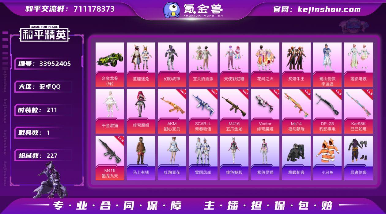 【A11921】安卓【小号/20王牌印记/小丑鱼/暗影哥特/合金龙骨(绿)/10粉装-8特效枪-1载具-3粉色飞行器】 手Q--78522热力值-20王牌印记-211套装-227枪皮 【热门品类】:粉装-童趣迷兔,套装-小丑鱼,套装-忍者信条,套装-龟仙人,套装-暗影哥特,套装-粉红小猪 【粉色套装】:粉装-幻影战神,粉装-宝贝奶油派,粉装-天使彩虹糖,粉装-花间之火,粉装-童趣迷兔,粉装-炙焰牛王,蜀山剑侠-李逍遥,粉装-莲影清波,角色-千金淑猫,角色-绯穹魔姬 【粉色枪皮等级】:AKM-甜心宝贝(七级),SCAR-L-青春物语(七级),M416-五爪金龙(七级),M416-墨龙九天(三级),Vector-绯穹魔姬(七级),Kar98K-巳巳如意(五级),Mk14-福马献瑞(五级),DP-28-豹影疾电(五级) 【粉色载具】:合金龙骨(绿) 【粉色枪皮】:AKM-甜心宝贝,SCAR-L-青春物语,M416-五爪金龙,M416-墨龙九天,Vector-绯穹魔姬,Kar98K-巳巳如意,Mk14-福马献瑞,DP-28-豹影疾电 【粉色飞行器】:炫彩糖果飞行器,花傲天飞行器 【粉色降落伞】:幻影战神降落伞,甜心宝贝降落伞,花间之火降落伞,烈焰拳霸降落伞,蓝莓炮弹降落伞,暗夜鎏金降落伞,仲夏莫吉托降落伞,未来歌姬降落伞,千金淑猫降落伞,金蛇镇世降落伞,鬼刀降落...