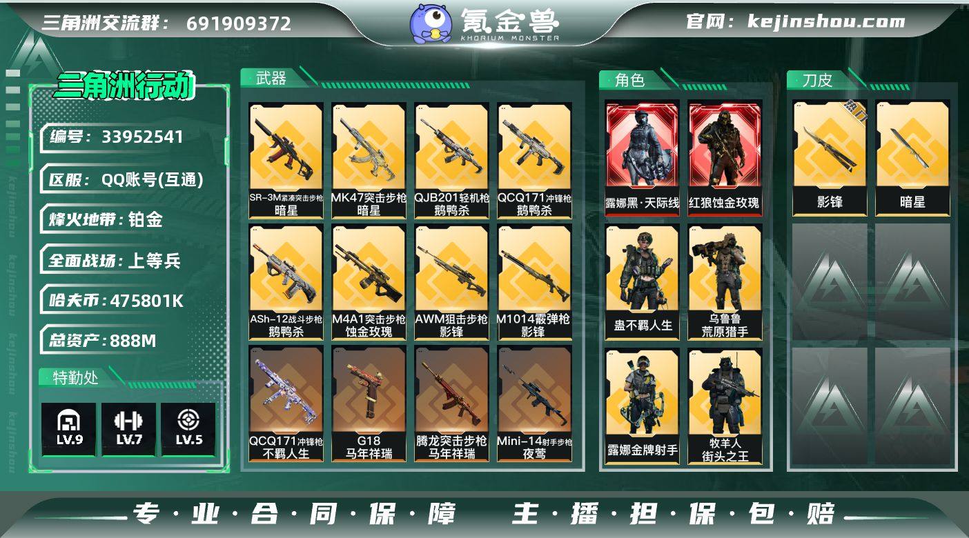 QQD259/包人脸/QQ区【高资产475M纯币+精品2刀2红皮】【总资产:888M+近战影锋+近战暗星+红狼蚀金玫瑰+露娜黑天际线】/烽火等级:60/全面战场:50/纯币:475M/三角券加币:109(29三角币+80三角券)【近战-影锋】【近战-暗星】【红狼-蚀金玫瑰】【露娜-黑天际线】【红狼-电锯惊魂】【威龙-铁面判官】【威龙-壮志凌云】【无名-夜鹰】【锋医-无题密令】【蛊-不羁人生】【牧羊人-街头之王】【乌鲁鲁-荒原猎手】【深蓝-不破誓约】【露娜-金牌射手】//部门:33333/特勤等级(技术中心3级/工作台3级/制药台3级/防具台3级/仓库9级/指挥中心6级/训练中心7级/靶场5级/潜水中心0级/收藏室1级)---影锋捆绑包/暗星捆绑包---/橙色挂饰x13/流动资产:846M段位:铂金II/详细看图