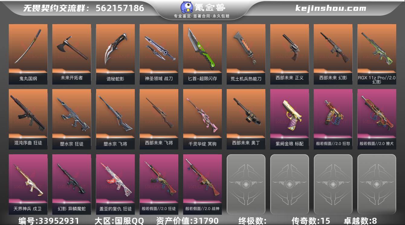 段位: 青铜 套装: 般若假面//2.0套装,西部未来 近战武器皮肤: 匕首-超限闪存,荒土机兵热能刀,鬼丸国纲-般若假面//2.0,神圣领域 战刀,未来开拓者-西部未来,诡秘蛇影 步枪皮肤: 狂徒-盖亚的复仇,戍卫-天界神兵,狂徒-塑水宗,狂徒-混沌序曲,狂徒-般若假面//2.0,獠犬-般若假面//2.0,幻影-RGX 11z Pro//2.0,幻影-异鳞魔蛇,幻影-西部未来 佩枪皮肤: 标配-紫阙金琅,狂怒-般若假面//2.0,正义-西部未来 狙击枪皮肤: 飞将-塑水宗,冥驹-千灵华绽,飞将-西部未来 机枪皮肤: 战神-般若假面//2.0,奥丁-西部未来 亮点: 【优质装备】:狂徒-塑水宗,冥驹-千灵华绽,狂徒-混沌序曲,狂徒-盖亚的复仇,标配-紫阙金琅,戍卫-天界神兵,飞将-塑水宗,匕首-超限闪存,荒土机兵热能刀,鬼丸国纲,神圣领域 战刀,未来开拓者,诡秘蛇影
