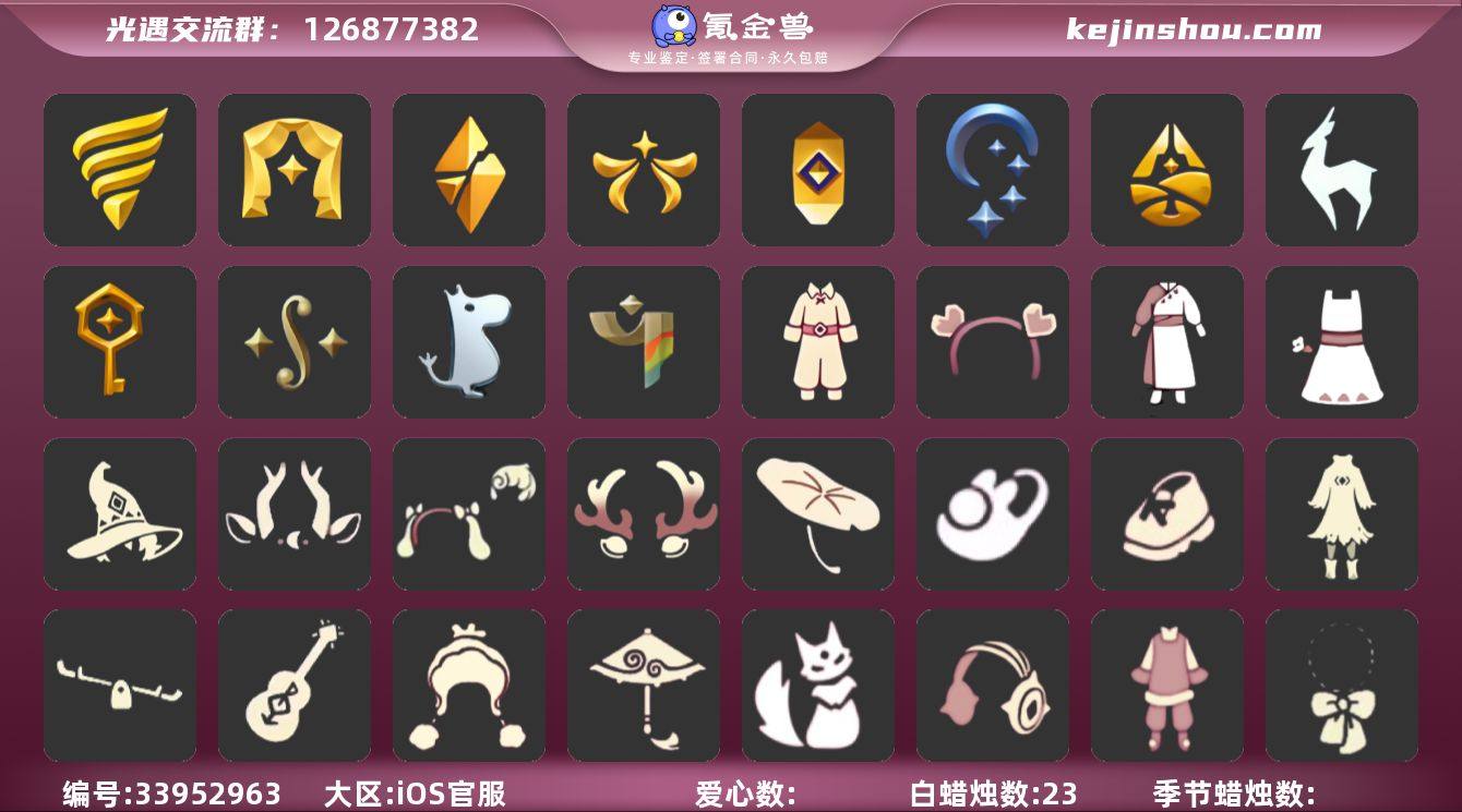 iOS官服 邮箱账号 3珍稀物品 15毕业季 23蜡烛 【珍稀物品】白枭(帝企鹅发),透明蝶翼斗,彩虹围巾(五塑彩带斗) 【季节已毕业】潜海季,表演季,破晓季,欧若拉季(欧若拉),追忆季,夜行季,归巢季,九色鹿(九色鹿季),筑巢季,二重奏季,姆明季,彩染季,双星季,迁徙季,织光季 【礼包】宝藏猎人礼包,优雅三件套(西装套装),女巫裙,兔子鞋(兔子拖鞋),运动鞋(跃动跑鞋),新年裤(瑞气服饰),龙鳞束身长袍,暗彩装扮(彩虹武士裤),向日葵连衣裙(连衣裙),蝴蝶结(大蝴蝶结),姆明饰品套装(姆明尾巴),活力海牛礼包,向日葵套(夏日有友礼包),绒帽(温暖绒帽),海蓝波浪发型(海洋发型),巫师(巫师帽),大耳狗装扮,心心相印发饰礼包,九色鹿角(神鹿祝福头饰)(神鹿祝福礼包),彩虹耳机,鹿角(圣诞鹿角),创始人(创始人斗篷),遥鲲披肩斗篷(披肩外袍),吉他(音韵吉他)(白吉他),小提琴(凯旋提琴),红伞(瑞气纸伞),荷叶伞,飞鸟纸伞,跷跷板(情人跷跷板),猫背饰(猫咪背饰),滑板(冲浪滑板)(冲浪板) 【裤子】筑巢季·裤子(设计师长袍),青鸟尊贵蓬头裤子(蓝色燕尾服),飞天裤(柔缎花边连)(九色鹿丝带裤),妮妮裙子(妮妮长裙),蓝绿裤(高领舞服),击剑裤 【面具】黄眉企鹅面具,夜行毕业面具(棕熊面具),呼吸面具(潜水面具),辉光羚羊面具,...