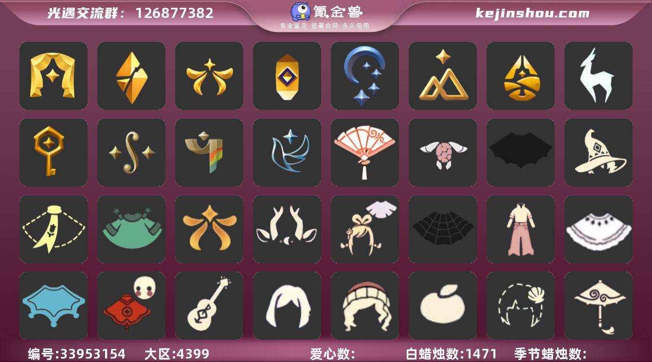 安卓官服 手机账号 3珍稀物品 12毕业季 6毕业图 1471蜡烛 【珍稀物品】白枭(帝企鹅发),透明蝶翼斗,彩虹围巾(五塑彩带斗) 【季节已毕业】表演季,破晓季,欧若拉季(欧若拉),追忆季,夜行季,拾光季,归巢季,九色鹿(九色鹿季),筑巢季,二重奏季,彩染季,青鸟季 【完成地图】晨岛,云野,雨林,霞谷,墓土(暮土),禁阁 【礼包】牛仔裤(阔腿牛仔),新年裤(瑞气服饰),蝴蝶结(大蝴蝶结),水母(水母肩饰),向日葵套(夏日有友礼包),奔跑发型(奔离远行发),海蓝波浪发型(海洋发型),彩虹帽(多彩绒帽),巫师(巫师帽),绊爱(绊爱斗篷)(绊爱礼包),橘子(大橘大利),雪花(雪花发夹),贝壳(贝壳发饰),兔子(玉兔头饰)(玉兔发饰)(兔子发饰),四叶草(四叶草头饰),星月头饰(星月头冠),九色鹿角(神鹿祝福头饰)(神鹿祝福礼包),新年耳钉(金鳞耳饰),彩虹耳钉(彩虹耳饰),彩虹耳机,日光耳环,枯角(巫树犄角),创始人(创始人斗篷),围巾(小王子斗篷)(小王子围巾),星球斗(星球夹克),欧若拉之翼,莲花斗(异彩莲花斗篷),福娃(福娃礼包)(春之日礼包)(铜钱斗),海龟斗篷,遥鲲披肩斗篷(披肩外袍),蝙蝠套(蝙蝠斗篷)(南瓜头),蜘蛛斗(蛛丝斗篷)(蛛网斗篷),瑞雪(瑞雪斗篷)(暖冬瑞雪),白绒金(白雪斗篷),青衫落拓礼包,吉他(音韵吉他)(白吉他),红...