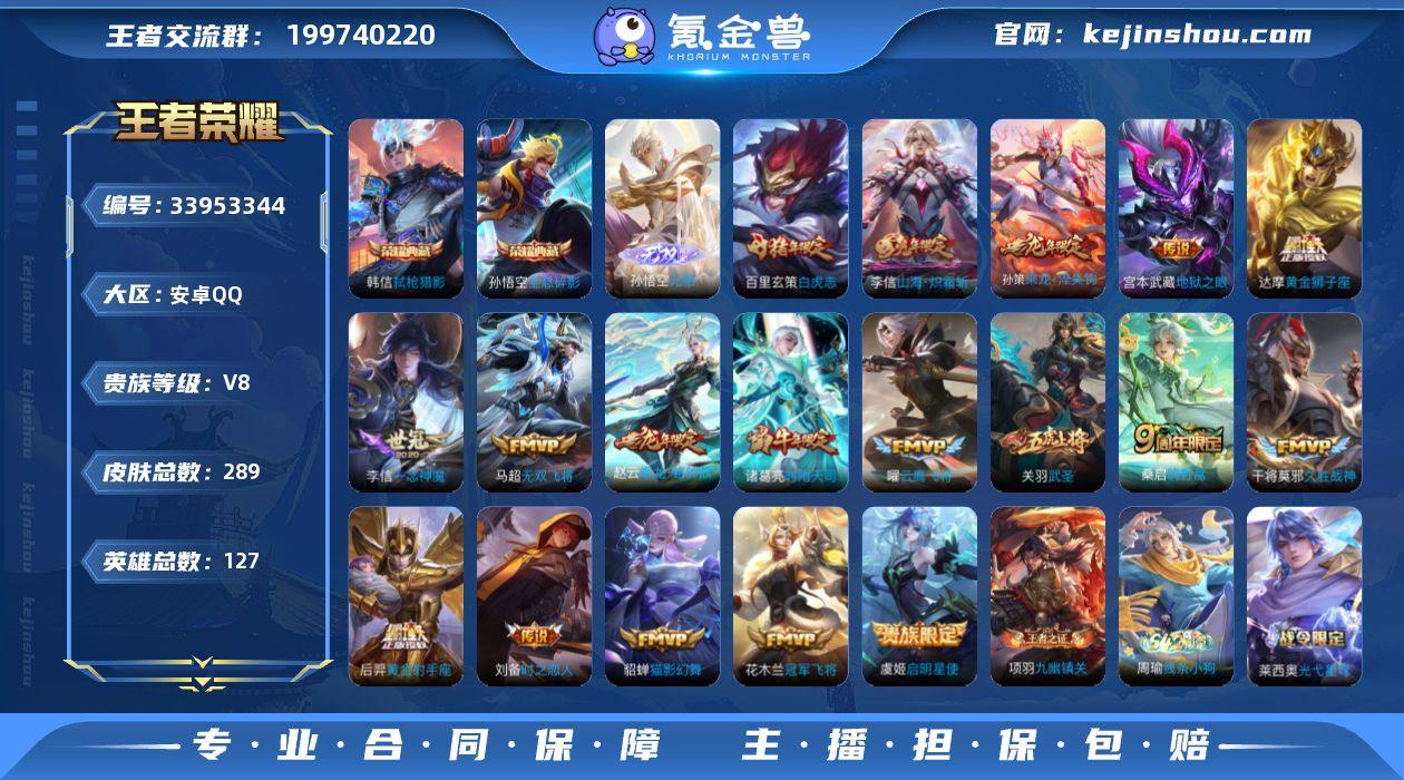 实名: 可修改 性别: 男号 贵族等级: V8 英雄数: 127 皮肤数: 289 荣耀水晶: 全息碎影,弑枪猎影 无双皮: 无相 传说皮: 黄金狮子座,黄金射手座,冠军飞将,云鹰飞将,猫影幻舞,久胜战神,一念神魔,地狱之眼,时之恋人-刘备,无双飞将,山海·炽霜斩,乘龙·铭钟鼎,乘龙·淬吴钩 限定皮: 李小龙,梁祝,时雨天司,武圣,岱宗,神威,飞衡,天狼绘梦者,白虎志,青龙志,朱雀志,至尊宝,高山流水,孙行者,匿光追影者,傲雪梅枪,五谷丰年,山海·玄木吟,鸣野蒿 亮点: 【优质装备】:全息碎影(猴子典藏),弑枪猎影(韩信典藏),黄金狮子座,黄金射手座,冠军飞将,云鹰飞将(小将军),猫影幻舞,久胜战神,一念神魔,地狱之眼,时之恋人-刘备(电焊工),无双飞将,山海·炽霜斩(李信年限)