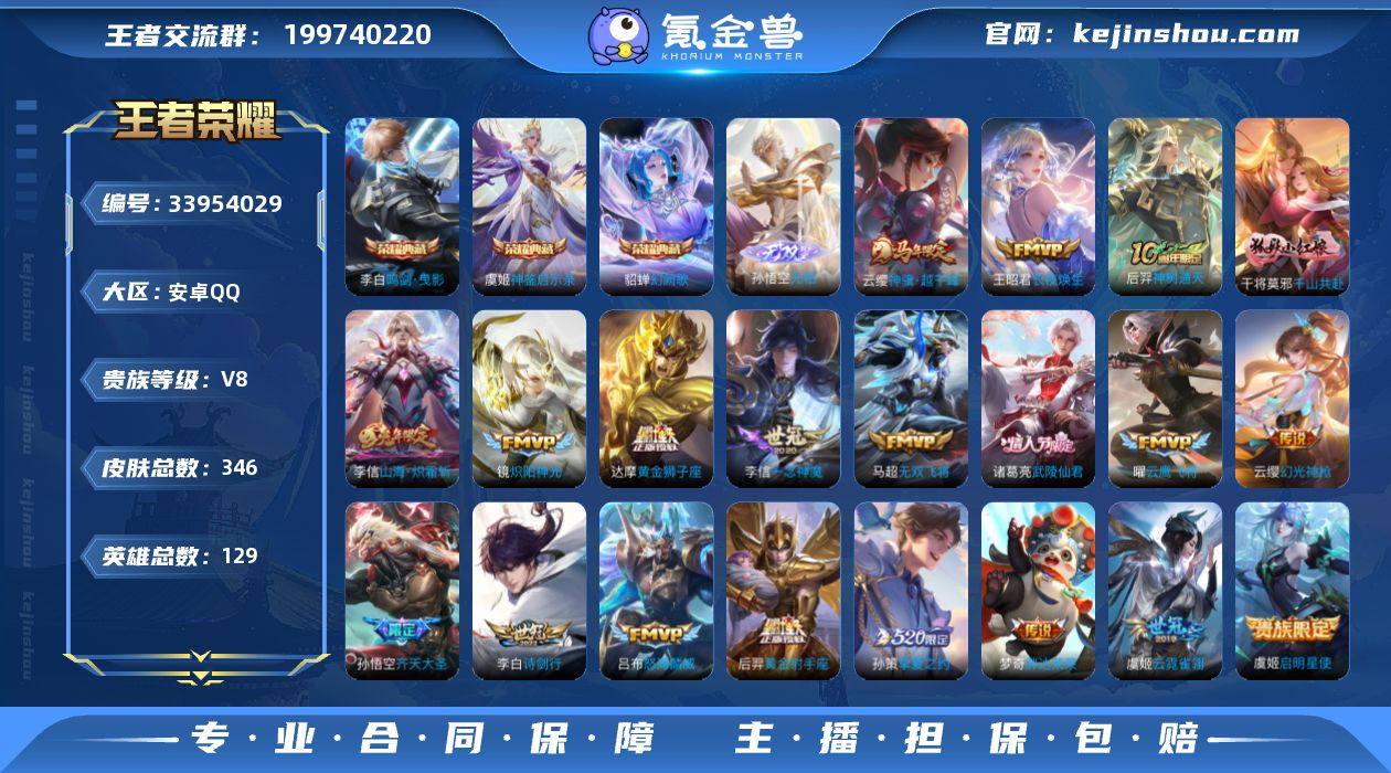 【王者荣耀】珍品无双0 典藏3 无双1 珍品传说0 传说26 史诗119 英雄129 皮肤346 贵族8级 荣耀典藏:神鉴启示录|幻阙歌|鸣剑·曳影__无双皮肤:无相__传说皮肤:无尽星芒|无双飞将|挚爱之约|孙尚香-异界灵契|炽阳神光|启明星使|胖达荣荣|云霓雀翎|黄金狮子座|黄金射手座|刘备-时之恋人|一念神魔|云鹰飞将|齐天大圣|怒海麟威|诗剑行|武陵仙君|项羽-无限倾心|逐花归海|山海·炽霜斩|幻光神枪|千山共赴|神树通天|长夜焕生|神骥·越千峰__稀有限定:至尊宝|朱雀志|大圣娶亲|神威|孙行者|傲雪梅枪|李小龙|梁祝|山海·玄木吟|拒霜思|百解令|百木心枪|大漠名商|地狱燃心|电玩高手|繁星吟游|高山流水|古海寻踪|海滩派对|海盐诗旅|胡桃异想国|幻夜卜梦|皇家上将|混沌棋|火炮绅士|剑破天穹|江河有灵|降魔|金庭之子|黎明之约|梦圆繁星|迷踪丽影|魔术师|女武神|奇幻香踪|千军破阵|擒涛扼浪|青焰无极|驱傩正仪|燃音魔法|荣光圣徽|沙漠行僧|探海日志|醍醐杖|天狼绘梦者|天穹祈灯|玩趣恶龙|万华元夜|妄想食味|无心|五谷丰年|午后时光|纤云弄巧|星界游侠|演武夺筹|夜都怪侠|疑决卦|阴阳师|吟游魔法|银河之约|驭风魔法|原初追逐者|云间偶戏|真爱魔法|暗夜贵公子|暗夜猫娘|暗隐猎兽者|暗渊魔法|白龙吟|缤...