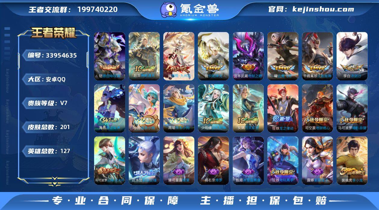 实名: 可修改 性别: 男号 贵族等级: V7 英雄数: 127 皮肤数: 201 荣耀水晶: 银白咏叹调 传说皮: 云鹰飞将,久胜战神,炽阳神光,地狱之眼,神树通天 限定皮: 李小龙,默契交锋-花木兰,五谷丰年,诗剑行,山海·玄木吟,愿照·九州拓 亮点: 【优质装备】:银白咏叹调(倪克斯侍卫),云鹰飞将(小将军),久胜战神,炽阳神光,地狱之眼