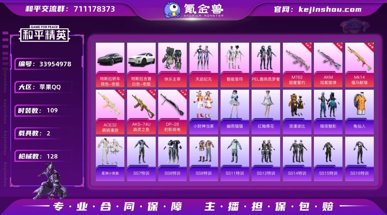 【LHPX1277】【特价出售/店主推荐】苹果 手Q-4粉装-6特效枪-2载具-1粉色飞行器-46208热力值-6王牌印记-109套装-128枪皮 【热门品类】:套装-龟仙人,套装-浪漫波比 【粉色套装】:粉装-快乐主宰,粉装-天启纪元,粉装-智能音符,粉装-PEL轰鸣竞梦者 【粉色枪皮等级】:AKM-炫紫旋律(六级),M762-甜蜜誓约(七级),ACE32-萌骑漫游(三级),AKS-74U-森灵之息(三级),Mk14-福马献瑞(四级),DP-28-豹影疾电(三级) 【粉色载具】:特斯拉Model 3(冷光银),特斯拉Model X(珍珠白) 【粉色枪皮】:AKM-炫紫旋律,M762-甜蜜誓约,ACE32-萌骑漫游,AKS-74U-森灵之息,Mk14-福马献瑞,DP-28-豹影疾电 【粉色飞行器】:炫紫旋律飞行器 【粉色降落伞】:深海曼妙降落伞,快乐主宰降落伞,华贵君王降落伞,天启纪元降落伞,金风玉露降落伞,PEL轰鸣竞梦者降落伞,甜蜜誓约降落伞,四圣焕新降落伞,王牌四分卫降落伞 【稀有套装】:套装-龟仙人,套装-小财神当家,套装-星渊小夜曲,套装-雨过天青,套装-红釉青花,角色-幽雨猫猫 【稀有枪皮】:AKM-PEL轰鸣竞梦者,AKM-彩虹符号,AKM-影袭,AKM-星之信仰,AKM-灼热熔岩,AKM-萌趣颜团子,AKM-霓虹街区,M16A4-九霄,M16A4-幻世战舞者,M16A4...