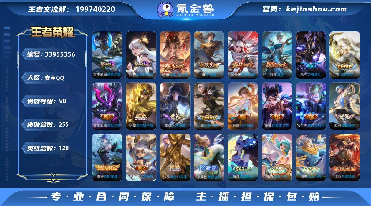 贵族8级,255皮肤,17传说,28星元,78史诗,4个性按键;【传说】:云缨幻光神枪,伽罗太华,公孙离祈雪灵祝,吕布天魔缭乱,宫本武藏地狱之眼,张良黄金白羊座,曜李逍遥,曜云鹰飞将,李信一念神魔,李元芳飞鸢探春,狄仁杰超时空战士,虞姬启明星使,貂蝉神骥聚万邦,貂蝉仲夏夜之梦,赵云淬星耀世,达摩黄金狮子座,镜炽阳神光;【星元】:宫本武藏幽冥之眼,貂蝉金色仲夏夜,小乔HelloKitty,安琪拉心灵冲击,妲己抹茶甜心,鲁班七号格斗小子,李元芳九夏金橙,孙尚香魔法恋语,公孙离觅星灵兔,王昭君暗香疏影,韩信急速电音,典韦时尚职员,孙策可可蛋糕,李元芳小丑鱼,伽罗气若幽兰,夏侯惇激情一夏,阿轲杏雨梨云,赵云玄秘纪元,阿轲染夜之绯,孙尚香时光恋人,安琪拉橙色警戒,亚瑟橙色警戒,妲己丝绒拿铁,鲁班七号越野小将,典韦活力阳橙,王昭君绯红主唱,小乔缤纷彩虹,孙策居家小哥;【史诗】:雅典娜神奇女侠,不知火舞魅语,云中君纤云弄巧,亚瑟心灵战警,伽罗天狼溯光者,元歌云间偶戏,元歌无心,兰陵王暗隐猎兽者,典韦蓝屏警告,典韦岱宗,刘禅电玩爆裂旋风,刘邦德古拉伯爵,夏侯惇乘风破浪,大乔白蛇,大乔猫狗日记,大乔白鹤