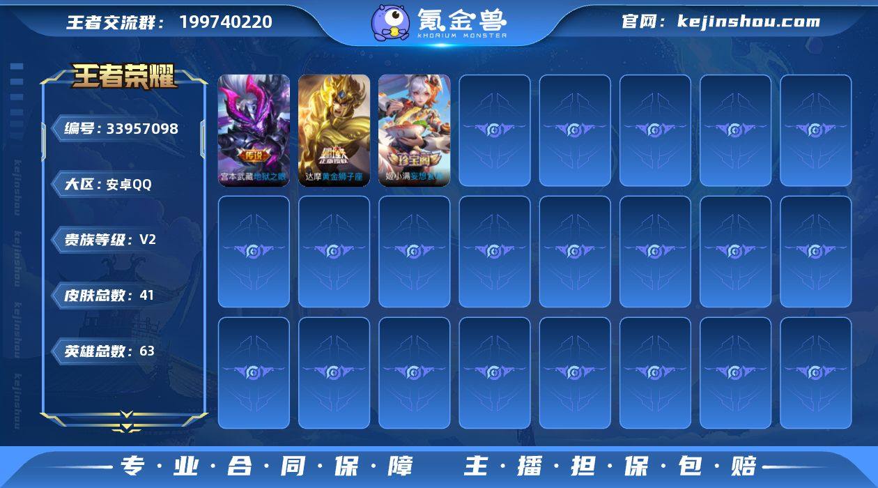 安卓Q 可二次 3传说63英雄41皮肤 黄金狮子座 超时空战士男 地狱之眼 黄忠百相守梦 水晶猎龙者 特工魅影 妄想食味 幽灵船长 末日机甲男 暗夜贵公子 街头霸王 暗渊魔法 鬼剑武藏 克喵 水果甜心 鹰眼统帅 王者荣耀账号