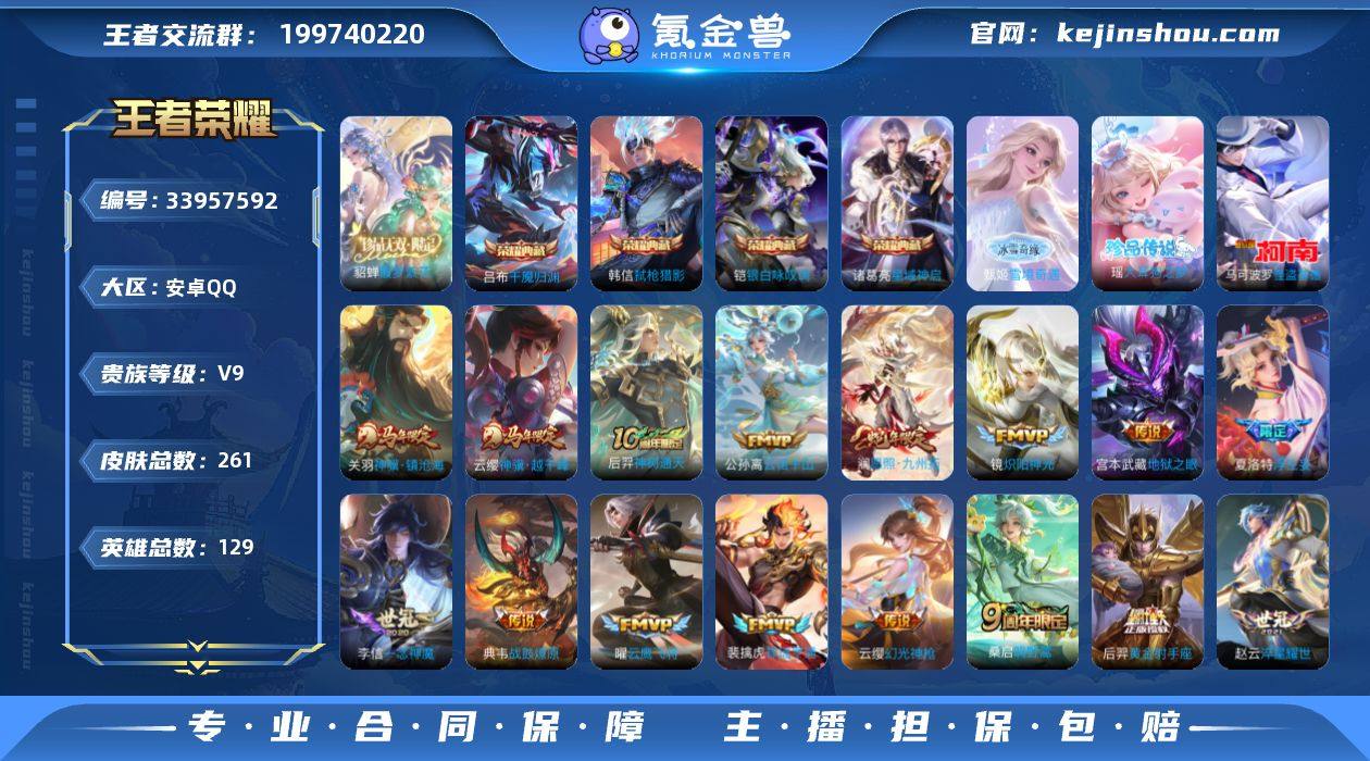 安卓Q-V9-最强王者段位-129英雄-261皮肤-4典藏皮肤-1珍品无双-1无双-2珍品传说-21传说-87史诗 【英雄全皮】:夏洛特全皮 【荣耀典藏】:诸葛亮星域神启,铠银白咏叹调,韩信弑枪猎影,吕布千魇归渊 【珍品无双】:貂蝉馥梦繁花 【无双皮肤】:甄姬雪境奇遇 【珍品传说】:瑶大耳狗之梦,马可波罗怪盗基德 【传说皮肤】:云缨神骥越千峰,关羽神骥镇沧海,后羿神树通天,公孙离云诺千山,澜愿照九州拓,云缨幻光神枪,裴擒虎祥瑞亨通,桑启鸣野蒿,典韦战鼓燎原,东皇太一灼幽烈阳,夏洛特浮生妄,赵云淬星耀世,王昭君乞巧织情,铠绛天战甲,镜炽阳神光,虞姬启明星使,曜云鹰飞将,李信一念神魔,张良黄金白羊座,后羿黄金射手座,宫本武藏地狱之眼 【限定皮肤】:蒙犽顽岩魄,蔡文姬夏日便利店,虞姬夏日便利店,姜子牙天穹之誓,狄仁杰阴阳师,赵云皇家上将,墨子降魔,元歌无心,狄仁杰魔术师,达摩沙漠行僧,项羽海滩派对,程咬金演武夺筹,韩信飞衡,兰陵王金庭之子,孙悟空孙行者,李元芳云中旅人,虞姬启明星使,钟馗驱傩正仪,鬼谷子五谷丰年,裴擒虎擒涛扼浪,嫦娥拒霜思,鲁班大师探海日志,桑启海盐诗旅,夏洛特浮生妄,暃星界游侠,艾琳流音漫舞,司空震地狱燃心...