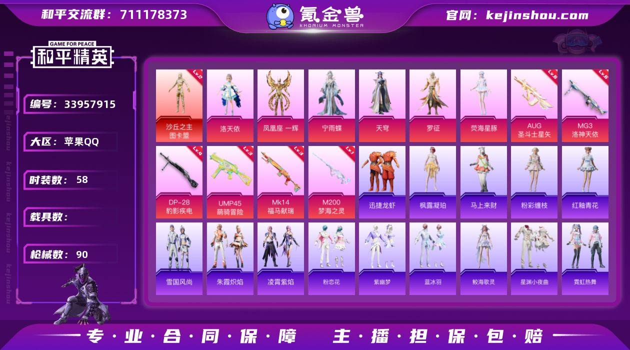 苹果手Q-1神装-6粉装-6特效枪-6粉色飞行器-31105热力值-58套装-90枪皮 【红色神装等级】:沙丘之主-图卡盟(二级) 【红色角色神装】:沙丘之主-图卡盟 【粉色套装】:角色-洛天依,角色-凤凰座 一辉,角色-宁雨蝶,角色-天穹,角色-罗征,角色-荧海星豚 【粉色枪皮等级】:AUG-圣斗士星矢(六级),UMP45-萌骑冒险(三级),Mk14-福马献瑞(三级),M200-梦海之灵(一级),DP-28-豹影疾电(四级),MG3-洛神天依(六级) 【粉色枪皮】:AUG-圣斗士星矢,UMP45-萌骑冒险,Mk14-福马献瑞,M200-梦海之灵,DP-28-豹影疾电,MG3-洛神天依 【粉色飞行器】:沙丘之主天马,曦光华影飞行器,幻星舰长飞行器,时光之誓飞行器,踏卷乘风飞行器,镜花水月飞行器 【粉色降落伞】:梦幻火箭降落伞,洛神天依降落伞,沙丘之主降落伞,圣斗士星矢降落伞,星穹咏叹调降落伞,时光之吻降落伞,时光之誓降落伞,天马神君降落伞 【稀有套装】:套装-雪国风尚,套装-马上来财,套装-迅捷龙虾,套装-粉恋花,套装-紫幽梦,套装-蓝冰羽,角色-鲛海歌灵,套装-星渊小夜曲,套装-霓虹热舞,套装-极速光影,套装-彩虹兔,套装-云朵鹅,套装-雪绒豹,角色-乐音,角色-黯羽织刑,角色-绛羽幽主,套装-朱霞炽焰,套装-...