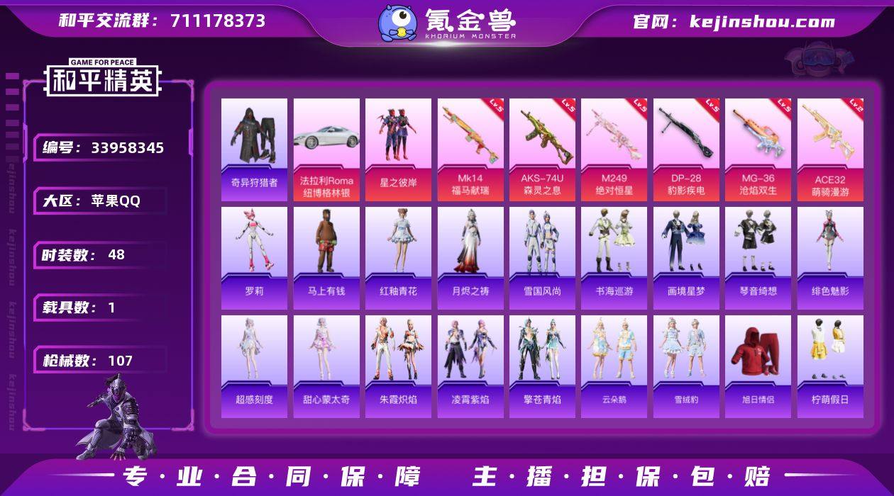 【LHPX1403】可 二次【特价出售/店主推荐】苹果 手Q-1粉装-6特效枪-1载具-2粉色飞行器-25399热力值-4王牌印记-48套装-107枪皮 【热门品类】:套装-奇异狩猎者 【粉色套装】:粉装-星之彼岸 【粉色枪皮等级】:ACE32-萌骑漫游(二级),AKS-74U-森灵之息(五级),Mk14-福马献瑞(五级),M249-绝对恒星(五级),DP-28-豹影疾电(五级),MG-36-沧焰双生(五级) 【粉色载具】:法拉利Roma(纽博格林银) 【粉色枪皮】:ACE32-萌骑漫游,AKS-74U-森灵之息,Mk14-福马献瑞,M249-绝对恒星,DP-28-豹影疾电,MG-36-沧焰双生 【粉色飞行器】:炫彩糖果飞行器,极意拳锋飞行器 【粉色降落伞】:绝对恒星降落伞,星之彼岸降落伞,冷漠罗丽降落伞,智趣喵喵降落伞,炫彩糖果降落伞 【稀有套装】:角色-超感刻度,角色-甜心蒙太奇,套装-雪国风尚,套装-炫彩糖果,角色-罗莉,套装-马上有钱,套装-云朵鹅,套装-雪绒豹,套装-朱霞炽焰,套装-凌霄紫焰,套装-擎苍青焰,角色-绯色魅影,套装-书海巡游,套装-画境星梦,套装-琴音绮想,角色-月烬之祷,套装-雨过天青,套装-红釉青花 【稀有枪皮】:AUG-冰晶雪宝,AKM-破晓战魂,AKM-龙的传人,M16A4-红色方程式,M16A4-蓝色火焰,SCAR-L-夜灯,SCAR-...