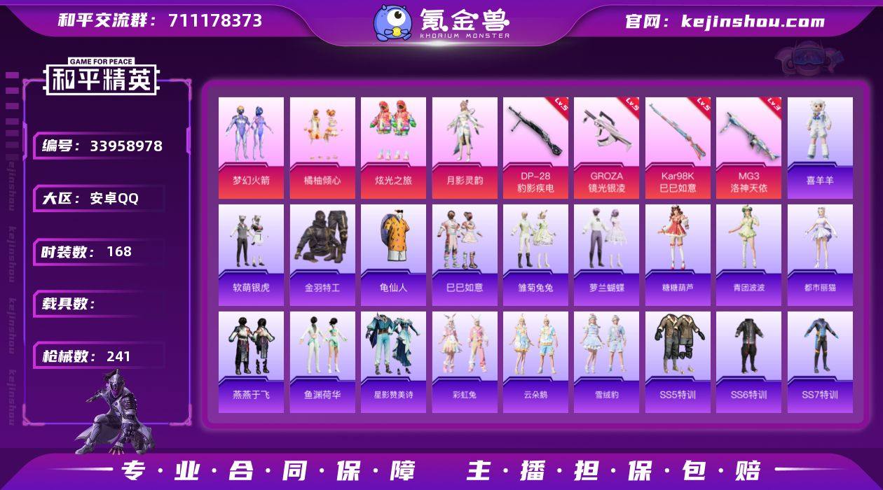 安卓手Q-4粉装-4特效枪-4粉色飞行器-67552热力值-15王牌印记-168套装-241枪皮 【热门品类】:粉装-梦幻火箭,套装-金羽特工,套装-龟仙人 【粉色套装】:粉装-梦幻火箭,粉装-橘柚倾心,粉装-炫光之旅,角色-月影灵韵 【粉色枪皮等级】:GROZA-镜光银凌(五级),Kar98K-巳巳如意(五级),DP-28-豹影疾电(五级),MG3-洛神天依(三级) 【粉色枪皮】:GROZA-镜光银凌,Kar98K-巳巳如意,DP-28-豹影疾电,MG3-洛神天依 【粉色飞行器】:梦幻火箭飞行器,齐天大圣飞行器,黄族统领飞行器,雀灵庇佑飞行器 【粉色降落伞】:梦幻火箭降落伞,潮汐统领降落伞,洛神天依降落伞,海渊国主降落伞,暗星紫秘降落伞,垂柳戏鸭降落伞,圣堂之誓降落伞,沙丘之主降落伞,镜域双华降落伞,拳皇·狂花道降落伞,未来领航者降落伞 【稀有套装】:套装-龟仙人,套装-巳巳如意,套装-雏菊兔兔,套装-萝兰蝴蝶,套装-糖糖葫芦,套装-青团波波,角色-都市丽猫,套装-燕燕于飞,套装-鱼渊荷华,套装-星影赞美诗,套装-彩虹兔,套装-云朵鹅,套装-雪绒豹,玩偶服-喜羊羊 【稀有枪皮】:AKM-2P战斗服款,AKM-彩虹符号,AKM-星之彼岸,AKM-破晓战魂,AKM-虎虎生威,AKM-霓虹街区,M16A4-幻世战舞者,M16A4-甜...