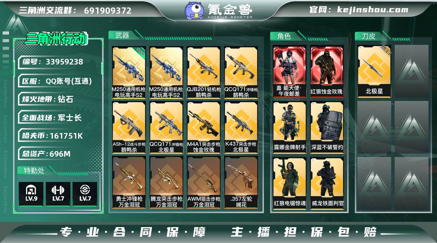 【热门皮肤号:双红+单刀+单典藏-威龙-铁面判官/高额资产696M】【Q区三端互通】【可二次】YXz9739-特勤处:仓库9级/靶场7级/训练中心7级 总资产696m-哈夫币161m-60烽火等级-钻石-50战场等级-军士长 【干员外观】:红狼-蚀金玫瑰,蛊-能天使午夜邮差,威龙-铁面判官,蜂医-送葬人·无题密令,无名-夜鹰,深蓝-不破誓约,红狼-电锯惊魂,露娜-金牌射手 【近战皮肤】:近战-北极星,近战-黑鹰 【典藏外观】:M250通用机枪-电玩高手S2 【典藏外观成色】:M250通用机枪-电玩高手S2(优品B) 【传说外观】:M4A1突击步枪-蚀金玫瑰,M4A1突击步枪-阿米娅,QBZ95-1突击步枪-破军,ASh-12战斗步枪-鹅鸭杀,SG552突击步枪-运动员,AK-12突击步枪-夜鹰,AK-12突击步枪-特斯拉线圈,SCAR-H战斗步枪-启航,G3战斗步枪-骑士,CAR-15突击步枪-阿米娅,腾龙突击步枪-捞点薯条,腾龙突击步枪-万金泪冠,K437突击步枪-北极星,KC17突击步枪-电锯惊魂,Vector冲锋枪-能天使-午夜邮差,UZI冲锋枪-特斯拉线圈,SMG-45冲锋枪-骑士,SR-3M紧凑突击步枪-特斯拉线圈,勇士冲锋枪-能天使-午夜邮差,勇士冲锋枪-万金泪冠,QCQ171冲锋枪-北极星,QCQ171冲锋枪-鹅鸭杀,725双管霰弹枪-送葬人-无题密令,M250通...