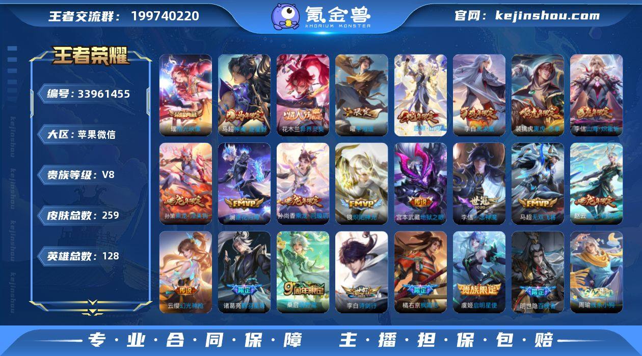 实名: 可修改 性别: 男号 贵族等级: V8 英雄数: 128 皮肤数: 259 荣耀水晶: 拾光映像 传说皮: 炽阳神光,一念神魔,地狱之眼,李逍遥,无双飞将,山海·炽霜斩,鹤羽星尊,澜逐花归海,乘龙·问璇玑,乘龙·铭钟鼎,乘龙·淬吴钩,幻光神枪,神骥·逐星野,异界灵契-花木兰 限定皮: 李小龙,游园惊梦,梁祝,御风骁将,凤求凰,瑞麟志,一生所爱,默契交锋-花木兰,匿光追影者,傲雪梅枪,寅虎·赤拳,枫霜尽,五谷丰年,诗剑行,山海·玄木吟,鸣野蒿,愿照·山河定 亮点: 【优质装备】:拾光映像(瑶典藏),炽阳神光,一念神魔,地狱之眼,李逍遥,无双飞将,山海·炽霜斩(李信年限),鹤羽星尊,澜逐花归海