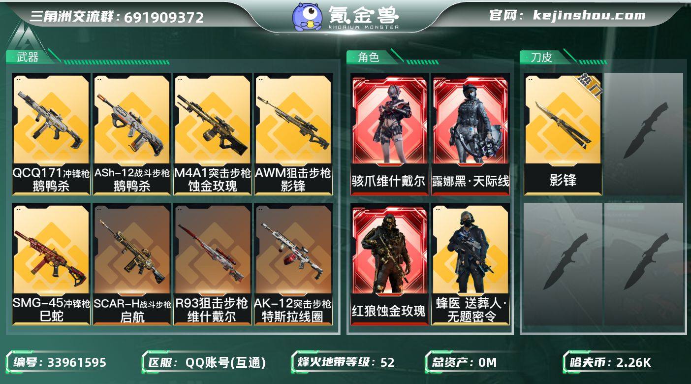 【SJZF8250】总资产66M/哈夫币226万/传说近战数1/传说枪皮数41/战场等级50/行动等级52/安全箱等时效性道具以游戏内数据为准,详情请看图/红狼-蚀金玫瑰/露娜-黑·天际线/骇爪-维什戴尔/威龙-凌霄戍卫/蜂医-送葬人·无题密令(S5)/深蓝-不破誓约/红狼-电锯惊魂/露娜-金牌射手/近战-暗星/影锋/黑鹰/M4A1突击步枪-棱镜攻势(典藏)/M4A1突击步枪-棱镜攻势(优品S)/M4A1突击步枪-蚀金玫瑰/M4A1突击步枪-阿米娅/AKM突击步枪-锦绣/QBZ95-1突击步枪-凌霄戍卫/ASh-12战斗步枪-鹅鸭杀/M16A4突击步枪-狩猎时刻/SG552突击步枪-运动员/AK-12突击步枪-特斯拉线圈/SCAR-H战斗步枪-启航/G3战斗步枪-狩猎时刻/G3战斗步枪-骑士/CAR-15突击步枪-黑鹰坠落/CAR-15突击步枪-阿米娅/腾龙突击步枪-死神玫瑰/腾龙突击步枪-万金泪冠/K437突击步枪-锦绣/KC17突击步枪-电锯惊魂/47突击步枪-暗星/Vector冲锋枪-狩猎时刻/UZI冲锋枪-特斯拉线圈/SMG45冲锋枪-骑士/SMG-45冲锋枪-锦绣/SR-3M紧凑突击步枪-特斯拉线圈/SR-3M紧凑突击步枪-暗星/勇士冲锋枪-能天使-午夜邮差/勇士冲锋枪-万金泪冠/QCQ171冲锋枪-鹅鸭杀/M1014霰弹枪-影锋/725双管霰弹枪-送葬人-无题密令/M250通用机枪-骑士之心/QJB201轻机枪-鹅鸭杀/M14射手...