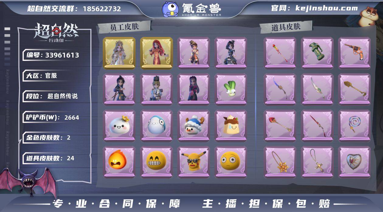 ZR792金皮:2,紫皮:5,白色皮肤:6,道具皮:24,外观:薇薇安-圣光之谕,巫铃儿-镜花辞,阿念-庆宴绮愿,小黄-异色序曲,阿念-王子与骑士,爱丽丝-丝缕哀歌,逍遥-绣春逍影,白色皮肤:小黄-青苔绿,小黄-孔雀绿,小黄-宝石红,小黄-牛仔蓝,小黄-素雅白,小黄-后室幸存者,道具:短管猎枪-星光的裁决,腰包-宝剑八,夜视仪-金丝眼镜,音响-happy猫,转轮手枪-新星时代,桃木剑-凤鸣九天,长鞭-飞天绫,黄牛能量饮料-青玉抱丹,闪光弹-金戈玄铜,音响-鸣沙鼓,铲子-龙鳞,铲子-圣心之泪,摸金符-花落精绝,摸金符-祝祷词,急救包-蔷薇物语,刺刀-紫气东来,长枪-糖葫芦霸王枪,荧光棒-桃心,刺刀-碧络琅环,背饰-牛啤背包,背饰-天使的呼唤,背饰-蝶恋花,员工:小黄,爱丽丝,零,阿念,逍遥,薇薇安,巫铃儿,莉莉,艾伦,爱德华,兰,小满,临云,头饰:芝麻糊汤圆,太空鲨头套,雪墩墩头套,樱桃奶油布丁,惊魂南瓜头套,鱼头怪头套,烈焰红唇头套,大葱明头套,火爆了头套,面具马头套,哈士奇头套,萨卡班甲鱼头套,嘻嘻头套,滑稽头套,呆滞头套,卑微头套,小狗蛇点点头套,咬咬鲨头套,炙热烧烤,像素朋克墨镜,芝麻糊汤圆,后室幸存者头套,挂饰:未竟乐园,天使消失的年代,钗头凤,糖果守卫,动作:打车摇,新年摇,不孬摇,luvaboy,刀马舞,鹏友摇,心跳摇,舞...