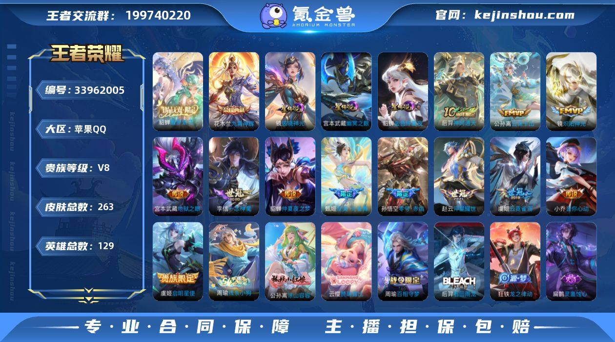 10王者印记1荣耀印记-2天幕繁华交响诗共赏芳华-3星传说一大推星史诗-质量女号-苹果Q-慕夏全套--美神降临称号-V8-最强王者段位-128英雄-263皮肤-1典藏皮肤-1珍品无双-12传说-89史诗-余3665紫币 【英雄全皮】:孙权全皮,空空儿全皮 【荣耀典藏】:花木兰九霄神辉 【珍品无双】:貂蝉馥梦繁花 【传说皮肤】:后羿神树通天,公孙离云诺千山,甄姬至美化雀舞,赵云淬星耀世,小乔音你心动,镜炽阳神光,虞姬启明星使,孙悟空零号赤焰,李信一念神魔,虞姬云霓雀翎,貂蝉仲夏夜之梦,宫本武藏地狱之眼 【限定皮肤】:狄仁杰阴阳师,赵云皇家上将,墨子神迹守卫,鲁班七号乒乒小将,高渐离玩趣恶龙,阿轲迷踪丽影,钟无艳超时空战士,扁鹊奇幻香踪,芈月白晶晶,吕布御风骁将,元歌云间偶戏,元歌无心,甄姬落雪兰心,甄姬至美化雀舞,马可波罗暗影游猎,狄仁杰魔术师,狄仁杰万华元夜,达摩星际陆战队,达摩沙漠行僧,项羽海滩派对,老夫子醍醐杖,老夫子航海奇遇记,程咬金演武夺筹,刘邦夺宝奇兵,王昭君凤凰于飞,王昭君午后时光,兰陵王金庭之子,亚瑟潮玩骑士王,孙悟空至尊宝,孙悟空零号赤焰,后羿圣弓游侠,李元芳云中旅人,虞姬启明星使,钟馗驱傩正仪,杨玉环遇见飞天,...