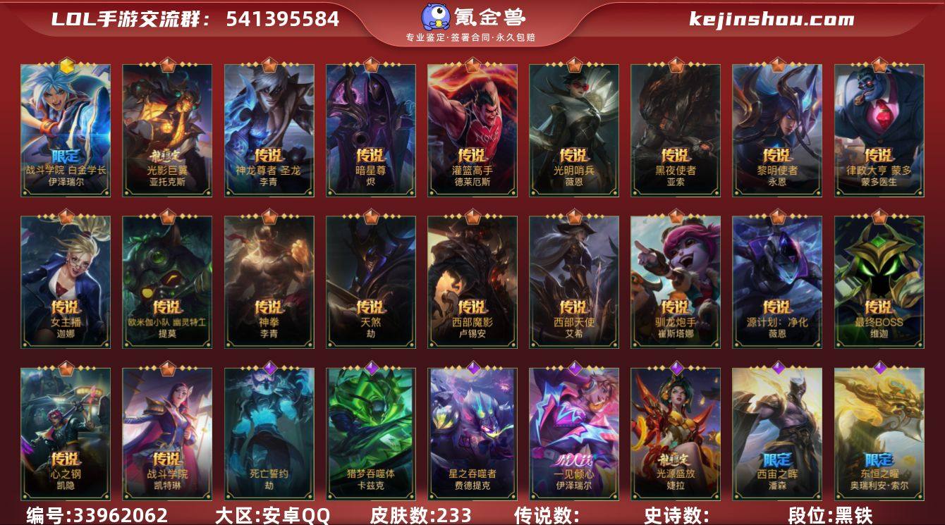 【LSQH39】130英雄/233皮肤/华贵铂金/桃映暖春 灼灼芳菲 拉克丝/战斗学院EZ白金学长/赵云子龙/烈焰美人薇恩/神龙烈焰金克丝/虎痴之拳/闭月之颜貂蝉/美猴王/山海绘卷剑魔/山海绘卷狗熊/光影巨翼亚托克斯/心之钢凯隐/源计划:净化/光明哨兵薇恩/暗星尊/源计划:超体/黑夜使者亚索/神龙尊者 昼日真龙 亚索/天煞劫/西部魔影卢锡安/驯龙炮手/欧米伽小队 幽灵特工/神拳盲僧/神龙尊者 圣龙 李青/律政大亨/黎明使者永恩/灌篮高手/女主播风女/西部天使寒冰/双城之战:殊途 杰斯/战斗学院女警/最终BOSS维迦/钢铁军团/腥红之月剑魔/殇之机器人/劲道美味 阿木木/雷喵喵尔/丧尸努努/小蜜蜂努努和威朗普/探梦奇旅艾克/暗星发条/星之守护者发条/无限烈焰/烈焰仙子皎月/光明哨兵黛安娜/赵云 子龙/霸天异形螳螂/猎梦吞噬体 卡兹克/清剿小队金克丝/双城之战:天资 金克丝/西部魔影人马/烘焙童谣猫咪/猛虎布隆/礼物选好了吗? 布隆/源计划:升华/霸天龙神龙王/灰烬领主/圣龙/东恒之曜奥瑞利安索尔/腥红之月卡牌/弹幕天使/电玩女神卡莎/魅惑女巫莫甘娜/玉剑传说 苍鸾/K/DA ALL OUT寡妇/清剿小队潘森/未来战士潘森/西宙之晖潘森/福牛守护者剑姬/苹果机器人/战场之王机器人/星之守护者萨勒芬妮/海之...