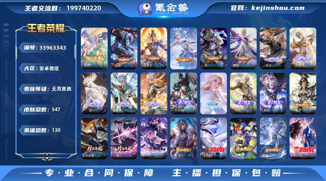 【无双贵族2026.5.20 10点到期】【金标韩信】【马年限定全套 蛇年限定全套】实名: 可修改 贵族等级: 无双贵族 英雄数: 130 皮肤数: 547 荣耀水晶: 武则天,九霄神辉,银白咏叹调,神鉴启示录,最初的交响,千魇归渊 无双皮: 碎月剑心,韩信群星魔术团,离恨烟,雪境奇遇-甄姬,器灵·螭龙剑,天机白泽,神罪,无相,问心剑 珍品传说: 江户川柯南,怪盗基德,时之奇旅-孙策,器灵·落星盏,兔狲·蓬尾,酷洛米之心,朽木白哉,黑崎一护,沧流箭 星传说: 幻海之心,未来机甲,幽冥之眼,太华·红枫,岁雨灵司,幻舞叠翠,破晓神光 传说皮: 黄金狮子座,黄金射手座,冠军飞将,云鹰飞将,黄金白羊座,猫影幻舞,久胜战神,炽阳神光,一念神魔,云霓雀翎,末日机甲-孙尚香,地狱火,仲夏夜之梦,音你心动-小乔,海洋之心,地狱之眼,飞鸢探春,音你心动-周瑜,胖达荣荣,乞巧织情,时之恋人-刘备,淬星耀世,挚爱花嫁,无双飞将,音你闪耀,碎云,山海·炽霜斩,山海·琳琅生,炽翼辉光,画中仙,浮生妄,鹤羽星尊,灼幽烈阳,妄想实况,惊梅引,鲁班七号-时之奇旅,夜礼服假面,霜月吟,澜逐花归海,艾琳觅芳踪,琥珀纪元铠,琥珀纪元马超,乘龙·问璇玑,乘龙·铭钟鼎,乘龙·淬吴钩,典韦战鼓燎原,落雪白狼,金乌负日,云中君群星魔术团,玄雷天君,幻光神枪,祥瑞亨通,...