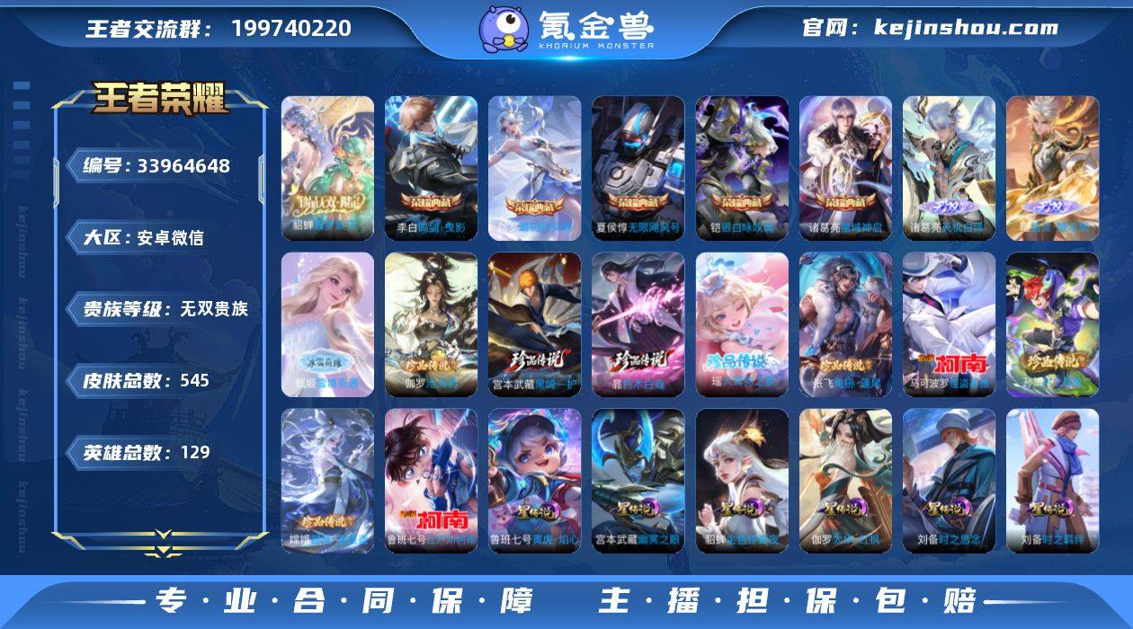 【区服】微信区(安卓) 【贵族】无双贵族V10,特权全部解锁,主页排面拉满 【皮肤】总共545款皮肤,全英雄满铭文,背包资源海量 【核心亮点】 ✅ 无双贵族标识,顶级账号排面 ✅ 大量荣耀典藏、年度限定、节日限定、绝版战令皮 ✅ 热门传说、直售史诗、限定联名皮肤齐全,热门英雄全皮 ✅ 无封号、无违规、无巅峰禁赛,干净安全 ✅ 可换绑、可二次实名,交易无忧,到手直接玩 ✅ 水晶碎片、皮肤碎片储备充足,后续随便换新皮 【账号优势】 全英雄满级熟练度,按键、天幕、拖尾、头像框、星元套装海量收集,收藏党、颜值党、全能上分号首选。日常排位、娱乐、带妹、打表现完全够用,成品大号无需额外氪金。 【报价】 标价:5000(可小刀,屠龙刀勿扰) 诚心出售,随缘出,走正规平台交易,杜绝私下被骗。