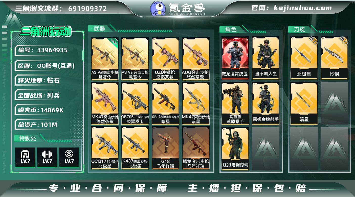 QJR293/包人脸/QQ区【As Val悬赏令优品S 0.2磨损】【总资产:102.6M+166发AWM子弹满体满负重猛攻号+近战怜悯+北极星+暗星+红皮凌霄戍卫】【蛊不羁人+乌鲁鲁荒原猎+露娜金牌射手+红狼电锯惊魂】/烽火等级:60/全面战场:35/纯币:14869k/三角券加币:236(三角币41+三角券195)//部门:33333/特勤等级(技术中心级/工作台级/制药台级/防具台级/仓库7级/指挥中心6级/训练中心7级/靶场7级/潜水中心1级/收藏室1级)---北极星捆绑包---/橙色挂饰x8/流动资产:70.2M段位:钻石二/详细看图
