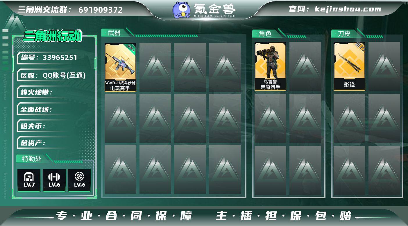 A找回包赔号-三角洲典藏枪皮蝴蝶刀号:【刀皮:影锋】【典藏皮肤:电玩SCAR-优品A】【干员皮肤:荒原猎手】【仓库六套+15发AW】【大红房卡+各种大红勇者之证】【总资产90M/现币1100W】【烽火60级/仓库7/体力6/负重6】