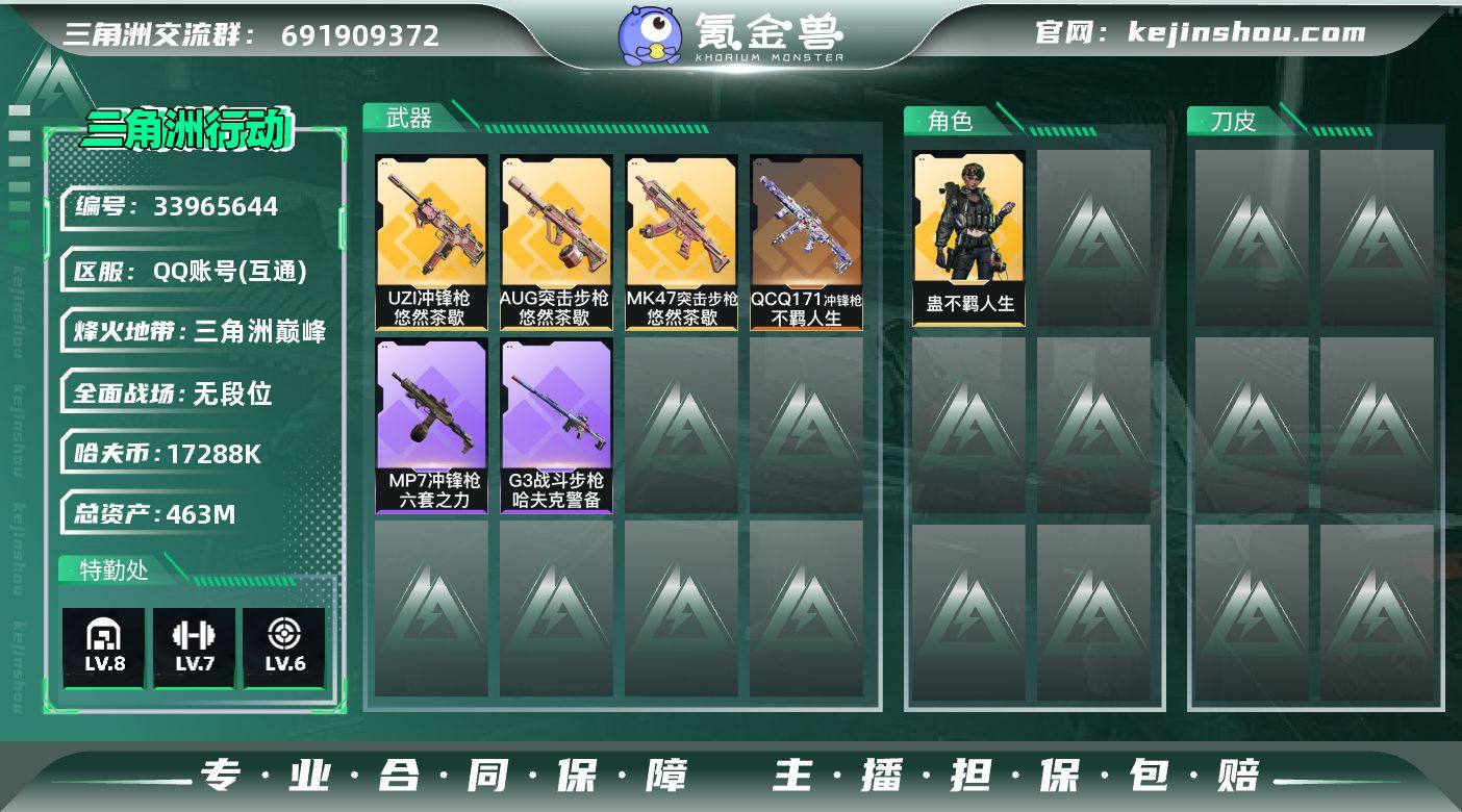 编号A02207 可二次 等级60 总资产463m 流动资产420m 哈夫币200m 基础安全箱 仓库lv8 训练中心lv7 靶场lv6