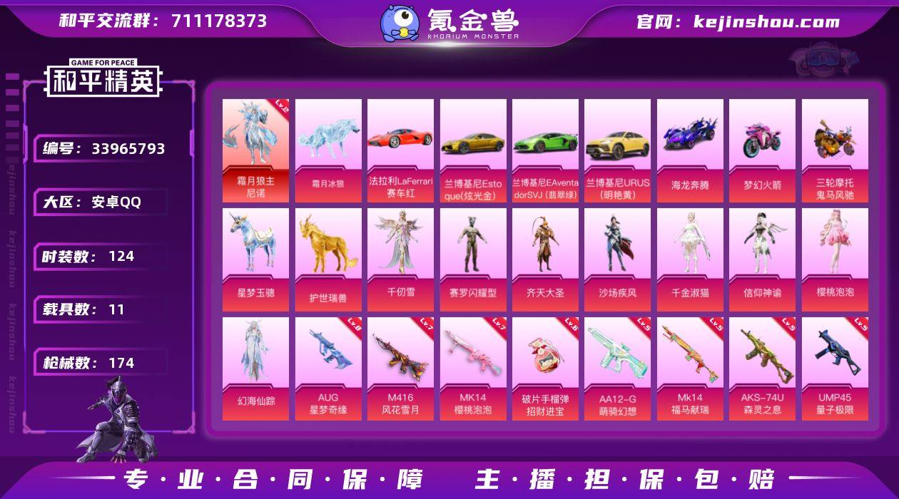 【LHPX2771】AUG-星梦奇缘(八级)【特价出售/店主推荐--热门套装萌熊小螳螂樱桃泡泡】安卓手Q-1神装-8粉装-12特效枪-11载具-11粉色飞行器-77643热力值-8王牌印记-124套装-174枪皮【红色神装等级】:霜月狼主-尼诺(二级)【热门品类】:套装-浪漫天命,套装-龟仙人,套装-萌熊伴侣,角色-8号机,角色-Mark.06【粉色套装】:角色-赛罗闪耀型,粉装-齐天大圣,粉装-沙场疾风,角色-千金淑猫,角色-信仰神谕,角色-樱桃泡泡,角色-幻海仙踪,角色-千仞雪【粉色枪皮等级】:M416-风花雪月(七级),M416-墨龙九天(三级),AUG-星梦奇缘(八级),UMP45-量子极限(五级),AKS-74U-森灵之息(五级),Kar98K-巳巳如意(三级),Mk14-樱桃泡泡(七级),Mk14-福马献瑞(五级),AA12-G-萌骑幻想(五级),烟雾弹-好运连连(二级),燃烧瓶-天降桃花(二级),破片手榴弹-招财进宝(六级)【粉色载具】:法拉利LaFerrari(赛车红),兰博基尼Aventador SVJ(翡翠绿),兰博基尼Estoque(炫光金),兰博基尼URUS(明艳黄),海龙奔腾,双人摩托-梦幻火箭,鬼马风驰,空客H135-蔚蓝之翼,星梦玉骢,护世瑞兽,霜月冰狼【粉色枪皮】:M416-风花雪月,M416-墨龙九天,AUG-星梦奇缘,UMP45-量子极限,AKS-74U-森灵之...