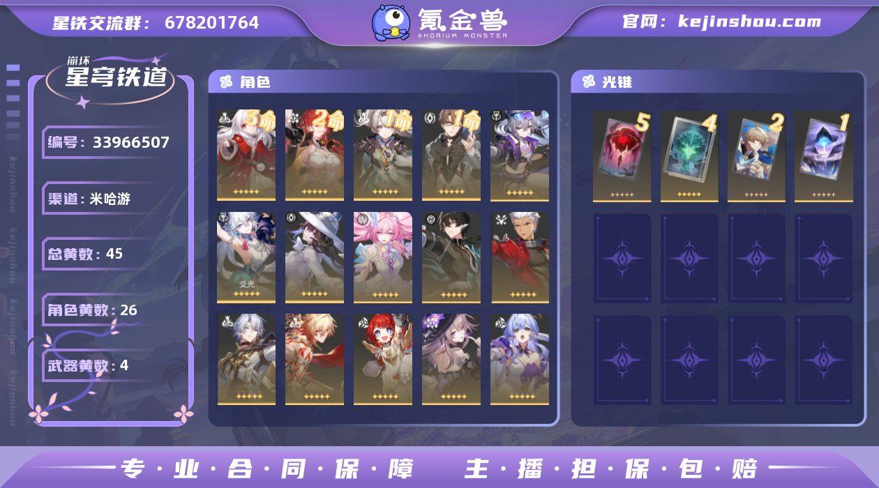 70级 角色总金数35 梦华0 星穹87 26个五星角色 星轨专票0 星轨通票0 0命银狼LV.99 0命白厄 0命爻光 0命昔涟 1命流萤 0命缇宝 0命丹恒•腾荒 0命知更鸟 0命大丽花 3命克拉拉 0命镜流 0命黄泉 0命白露 0命景元 0命符玄 0命万敌 0命Archer 0命大黑塔 2命彦卿 0命银狼 1命瓦尔特 0命阮•梅 0命真理医生 0命布洛妮娅 0命托帕 0命藿藿 2命姬子 四个金色光锥 精5记一位星神的陨落 精4不息的演算 精2致胜的瞬间 精1记忆永不落幕