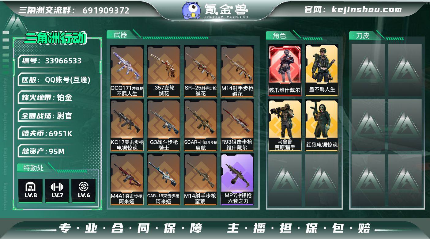 【PTSJZ4552】总资产95M/哈夫币695万/传说枪皮数11/战场等级27/行动等级60/安全箱等时效性道具以游戏内数据为准,详情请看图/骇爪-维什戴尔/红狼-电锯惊魂/乌鲁鲁-荒原猎手/蛊-不羁人生/近战-黑鹰/M4A1突击步枪-阿米娅/SCAR-H战斗步枪-启航/G3战斗步枪-骑士/CAR-15突击步枪-阿米娅/KC17突击步枪-电锯惊魂/QCQ171冲锋枪-不羁人生/M14射手步枪-蛮荒/M14射手步枪-缄花/SR-25射手步枪-缄花/R93狙击步枪-维什戴尔/.357左轮-缄花/勇士冲锋枪-檀劫铳影/K416突击步枪-冬日风情/K416突击步枪-腊梅/AUG突击步枪-蝮蛇/G3战斗步枪-哈夫克警备/腾龙突击步枪-聚光灯/K437突击步枪-丛林谍踪/MP5冲锋枪-战术竞备/P90冲锋枪-莫斯提马/SR-3M紧凑突击步枪-战术竞备/SR-3M紧凑突击步枪-开工大吉/勇士冲锋枪-丛林谍踪/MP7冲锋枪-六套之力/PKM通用机枪-蝮蛇/M249轻机枪-丛林谍踪/M250通用机枪-囚徒/QJB201轻机枪-炽焰/VSS射手步枪-丛林谍踪/SVD狙击步枪-阿萨拉工艺/SV98狙击步枪-猎鳄行动/M700狙击步枪-竞技风/SCAR-H战斗步枪-旧梦/SCAR-H战斗步枪-休闲时光/M7战斗步枪-捣蛋鬼/SG552突击步枪-2026/SG552突击步枪-马年新春/SG552突击步枪-贴花艺术/ AK-12突击步枪-马年新春/SCAR-H战斗步枪-荣耀列队/C...
