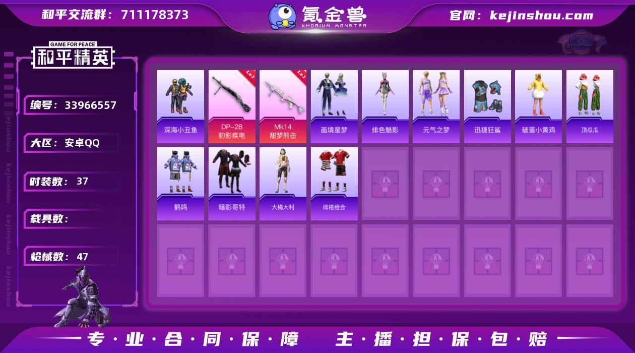 M1047945【2特效枪暗影哥特,深海小丑鱼身法号】安卓手Q-2特效枪-37套装-47枪皮-0王牌印记-坚韧铂金Ⅴ-10320热力值【2特效枪】DP-28-豹影疾电[5级],Mk14-甜梦熊击[5级]【2稀有】暗影哥特,深海小丑鱼【3飞行器】登顶巅峰飞行器,破刃行动尾迹,狂鲨锋刃飞行器【80其它衣服和枪皮】破蛋小黄鸡,迅捷狂鲨,顶瓜瓜,青涩时光,大橘大利,SS35特训,绯格组合,黑色伏地魔,SS36特训,元素星魂,绮丽涂鸦,街头潮人,白色伏地魔,特训学院,竞技名士,疯狂小兔子,旭日情侣,鹤鸣,画境星梦,青翼流星,黄色运动,竞技达人朋克,琴音绮想,湖蓝色名流,黄色伏地魔,元气之梦,猎鹰,海岛探路者,猛禽,角色-绯色魅影,魅力单车,SS38特训,超能勇士,红色运动,SS34特训,Mini14-耀粉歌者,MG-36-薄荷星砂,信号枪-异瞳寒姬,燃烧瓶-福马献瑞,DP-28-彩虹符号,ACE32-画境星梦,AKM-霓彩脉冲,汤姆逊-天降萌叽,十字弩-异域银装,MP5K-画境星梦,UZI-天降萌叽,AA12-G-画境星梦,十字弩-异瞳寒姬,S1897-糯团青竹,Kar98K-星穹咏叹调,SKS-炫彩节奏,SPAS-12-狂鲨锋刃,AWM-天降萌叽,平底锅-属我最6,ACE32-冰晶雪宝,AUG-紫晶流影,M417-玩趣呆呆,突击盾牌-绝对恒星,Mk14-薄荷星砂,MG3-幻世战舞者,MG3-霓彩脉冲,M762-彩虹符号,MG3-彩旗巡礼,S12K...