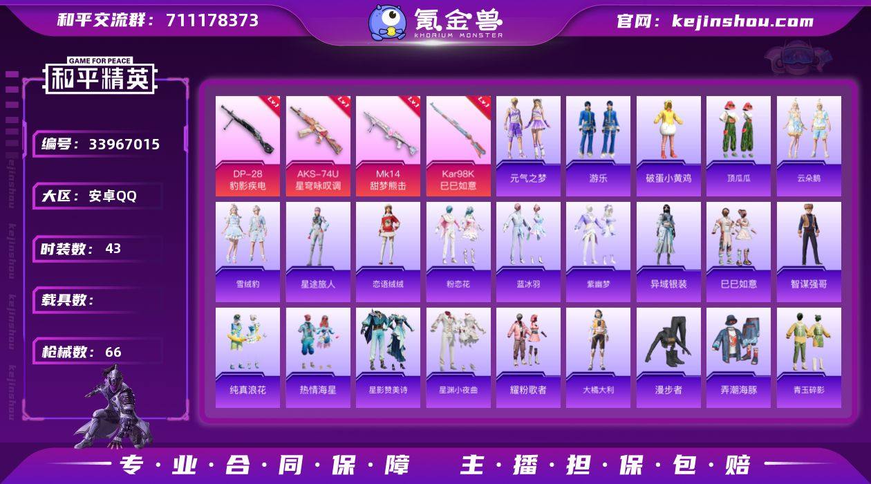 M1047942【地铁满天赋1粉装-4特效枪】无二次表不包 安卓手Q-1粉装-4特效枪-43套装-66枪皮-0王牌印记-英勇黄金Ⅱ-19378热力值【1粉装】角色-冷漠罗丽【4特效枪】AKS-74U-星穹咏叹调[5级],DP-28-豹影疾电[1级],Mk14-甜梦熊击[5级],Kar98K-巳巳如意[5级]【2飞行器】异域银装飞行器,顶峰精英尾迹【104其它衣服和枪皮】白色伏地魔,冷焰舞者,雪绒豹,星影赞美诗,纯真浪花,弄潮海豚,光之冒险,战术大师,薄荷星砂,大橘大利,星途旅人,彩虹兔,星渊小夜曲,破蛋小黄鸡,热情海星,吉莉礼服,元气之梦,特训学院,青玉碎影,漫步者,蓝色运动,SS33特训,粉恋花,缤纷果语,黑色伏地魔,绮丽涂鸦,蓝冰羽,龙魂突击队,魅力单车,异域银装,顶瓜瓜,恋语绒绒,游乐,智谋强哥,破晓战魂,暗黑骑手,紫幽梦,云朵鹅,超能勇士,耀粉歌者,巳巳如意,蜜露汐语,AUG-耀粉歌者,破片手榴弹-呆爆全场,Mk14-紫幽梦,Kar98K-顶峰精英,VSS-香桃花海,燃烧瓶-甜梦桃焰,AUG-异域银装,AKS-74U-鸡智如我,UZI-天降萌叽,SCAR-L-星途旅人,十字弩-异域银装,AUG-天降萌叽,SPAS-12-云朵鹅,M762-天降萌叽,AWM-纯真浪花,M416-红色方程式,Mk14-薄荷星砂,UMP45-海盐豹豹,沙漠之鹰-云朵鹅,VSS-虎痴许褚,平底锅-紫幽梦,QBZ-纯真浪花,MG3-幻世战舞者,蜜獾...
