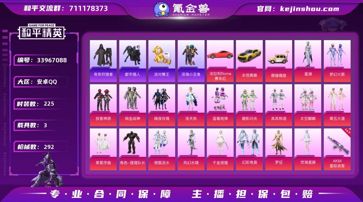 YZJ17499 可二次 安卓Q-5稀有3载具19粉装10特效枪17热门225套装292枪皮【身法素材女号 5卓越2传奇1绝世 满级心之恋语 满级AUG圣斗士 新火箭少女 都市 金鞋 洛天依 星豚 千金淑猫 第五 婚纱 绚金战神 岚岚物语 LED发光眼罩 深海小丑鱼 小丑鱼 蜘蛛侠 都市丽猫 无面战甲 美羊羊 红眼罩 】 109803热力值 11印记 历史绝世王牌13星 【5稀有】 奇异狩猎者 AKM-缤纷海域 都市猎人 派对舞王 派对舞王(金靴子) 【3载具】 法拉利Roma(赛车红) 永恒黄蜂 萌喵橘座 【19粉装】 梦幻火箭 千金淑猫 洛天依 荧海星豚 星渊 罗征 猩猩队长 风幻水境 太空嘟嘟 幻彩电音 放客神游 银瓶流水 挚爱序曲 第五大道 绚金战神 岚岚物语 暗夜玫瑰 蓝莓炮弹 碧影闪光 【10特效枪】 SCAR-L-时空协奏 (3级) M416-心之恋语 (7级) Kar98K-巳巳如意 (5级) M24-暗星紫秘 (7级) DP-28-豹影疾电 (5级) AUG-圣斗士星矢 (7级) AKM-星际浪客 (7级) GROZA-旋转彩虹 (7级) Mk14-福马献瑞 (5级) 破片手榴弹-招财进宝 (6级) 【17热门】 小丑鱼 龟仙人 呆萌铁蟹 鹰眼刺客 迅捷狂鲨 深海小丑鱼 暗影哥特 醒狮腾龙 团圆交子 瑞龙福将 粉红小猪 漫步者 冰爽海盐 破蛋小黄鸡 军刀雅典娜 弄潮海豚 M762-瑞龙福将 【2飞行器】 深...
