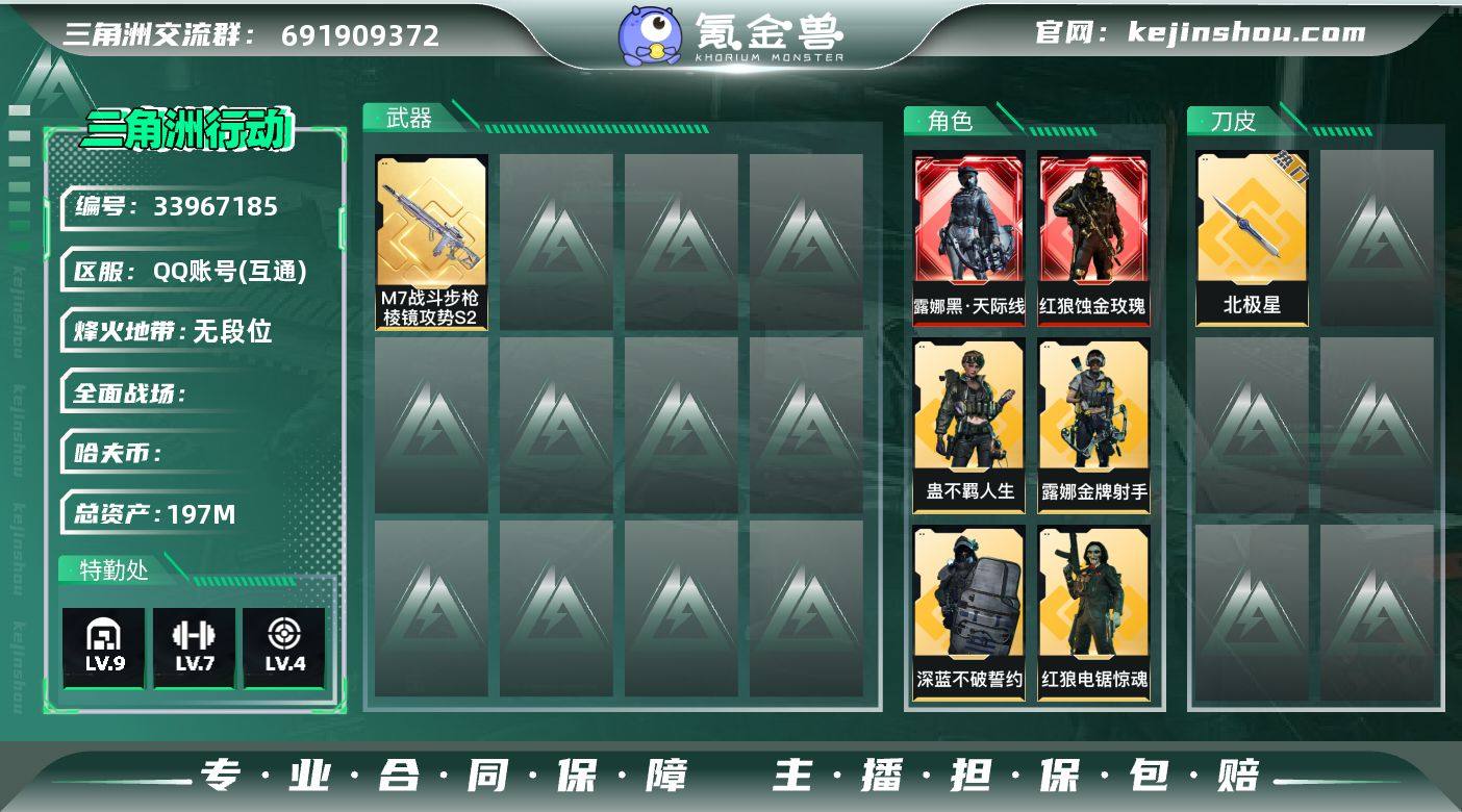197m总资产【干员外观】:威龙飞虎,红狼蚀金玫瑰,电锯惊魂,蜂医送葬人无题密令,无名夜鹰,蛊-不羁人生,深蓝不破誓约,露娜黑·天际线,露娜金牌射手【近战皮肤】:北极星【典藏1件】:M7棱镜S2