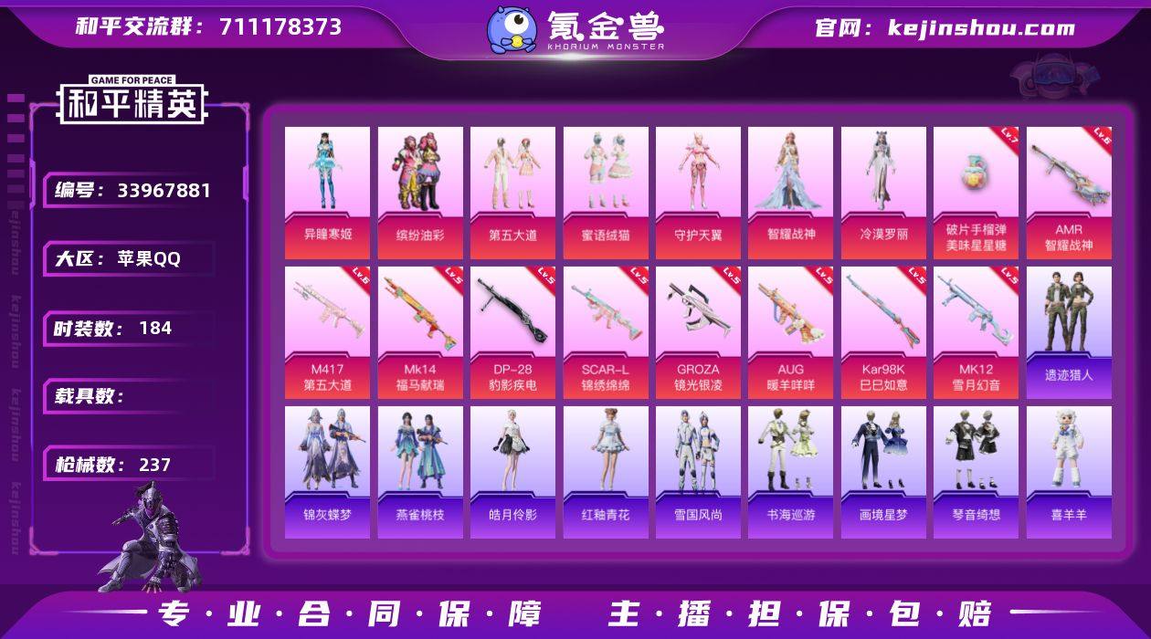 YZJ17665 可二次 苹果Q-7粉装10特效枪6热门184套装237枪皮 【精品萌妹号 地铁满天赋 420物资币 猪妹 蜜语绒猫 第五大道 权威小番茄 晶辉守护 粉团憨憨 绒宝小鹅 熊抱抱 白兰地假日 小丑鱼 卖崽青蛙 瑰梦爱神 玫纹锢梦 海琴烟 满级手雷美味星星糖 千金淑猫背包头盔 9款飞行器】 71775热力值 13印记 历史卓越王牌9星 【7粉装】 蜜语绒猫 异瞳寒姬 冷漠罗丽 守护天翼 智耀战神 缤纷油彩 第五大道 【10特效枪】 SCAR-L-锦绣绵绵 (5级) Kar98K-巳巳如意 (5级) DP-28-豹影疾电 (5级) AUG-暖羊咩咩 (5级) MK12-雪月幻音 (5级) AMR-智耀战神 (6级) GROZA-镜光银凌 (5级) M417-第五大道 (6级) Mk14-福马献瑞 (5级) 破片手榴弹-美味星星糖 (7级) 【6热门】 小丑鱼 龟仙人 红熊茄茄 晶辉守护 破蛋小黄鸡 极速红龙 【1头盔】 深海小丑鱼头盔 营地ID:934090515